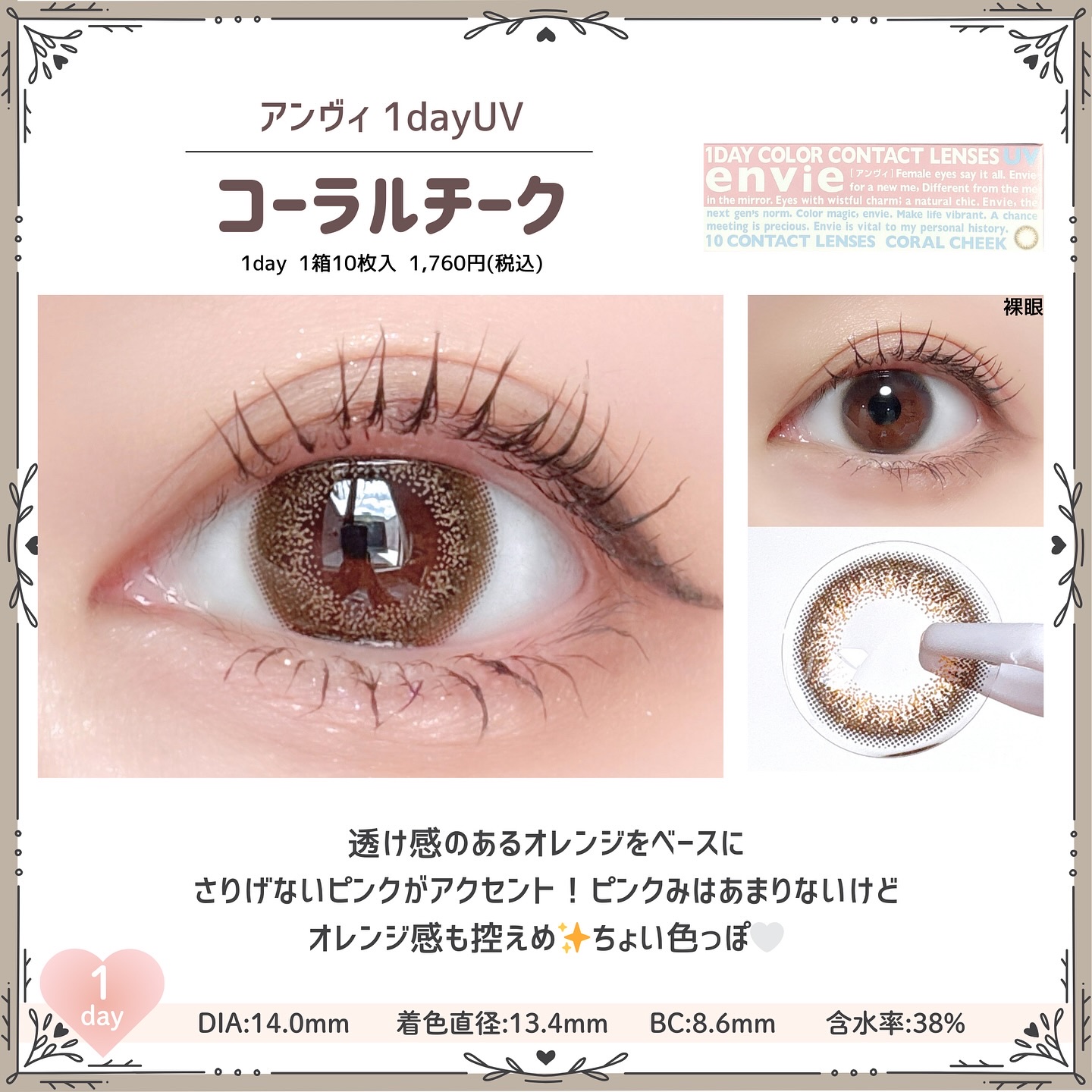 - 1DAYタイプで毎日リフレッシュ 超薄型レンズで自然なつけ心地 UVカットで瞳にも紫外線対策を※コンタクトレンズのUVカット機能は目全体及び目の周辺を完全に覆っているわけではないので、UV防止用眼鏡・サングラスの代用にはなりません。 非イオン性レンズで瞳に配慮 独自のBNW-3D製法 含水率38%の低含水で乾きにくい ●UVカット:UV-A(波⻑:315〜380nm)透過率:50%未満、UV-B(波⻑:280〜315nm)透過率:5%未満 カラーコンタクトレンズの不適正使用による眼障害の危険性等などがあります。 ●コンタクトレンズは高度管理医療機器です。不十分な洗浄・消毒など不適切なケアや、長時間・交換期間を超えた装用により、アレルギー性結膜炎、角膜感染症、角膜潰瘍等の重篤な眼障害が発生する危険性があります ●ご使用前に取扱説明書を確認してください 使用上の留意事項 ●眼科医院等を受診してからお求めください ●眼に異常を感じたら直ちにレンズ使用を中止し、お近くの眼科等で診察を受けてください ●医師の指示にしたがってご使用ください ●コンタクトレンズを装用する場合、自覚症状がなくても、眼科医院等での定期検査を受けてください ●レンズに不具合がある場合は使用しないでください
