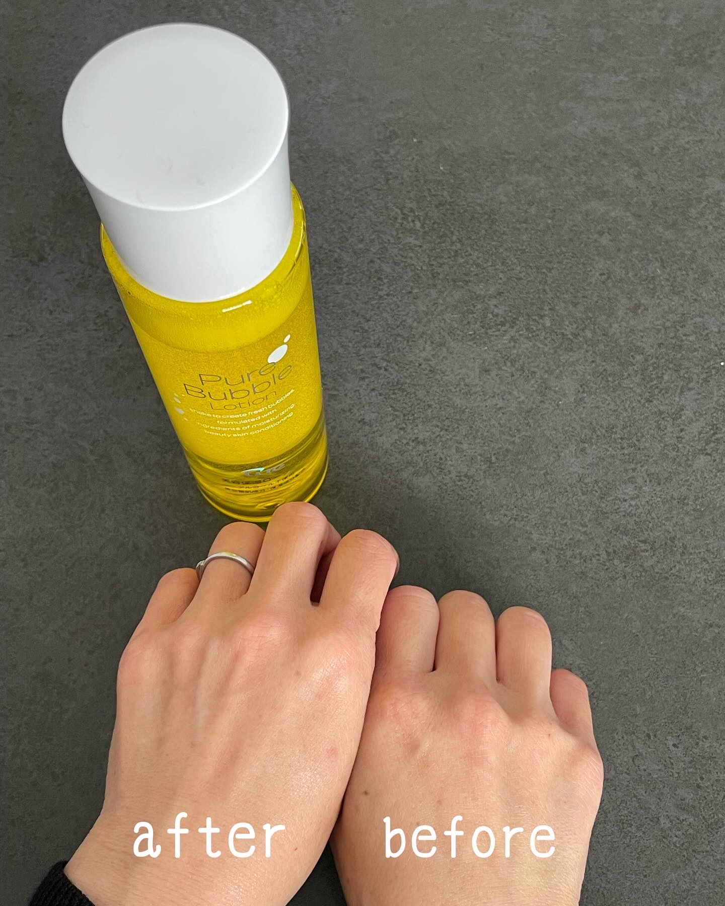使う前にボトルを振ると、毛穴よりも小さく目に見えない超微細な泡であるナノバブルが発生𓆸 下に2つの特殊なボールが入った黄色のパッケージも珍しくて素敵🧴 手に取った瞬間はさらっとしているけど、馴染ませると美容液のようにしっとりしたテクスチャーに🌿 毎日使っていると、肌にハリが出て毛穴も目立ちにくくなった感じがします^^ 毛穴が目立つのが悩みなのでとても助かっています🫶