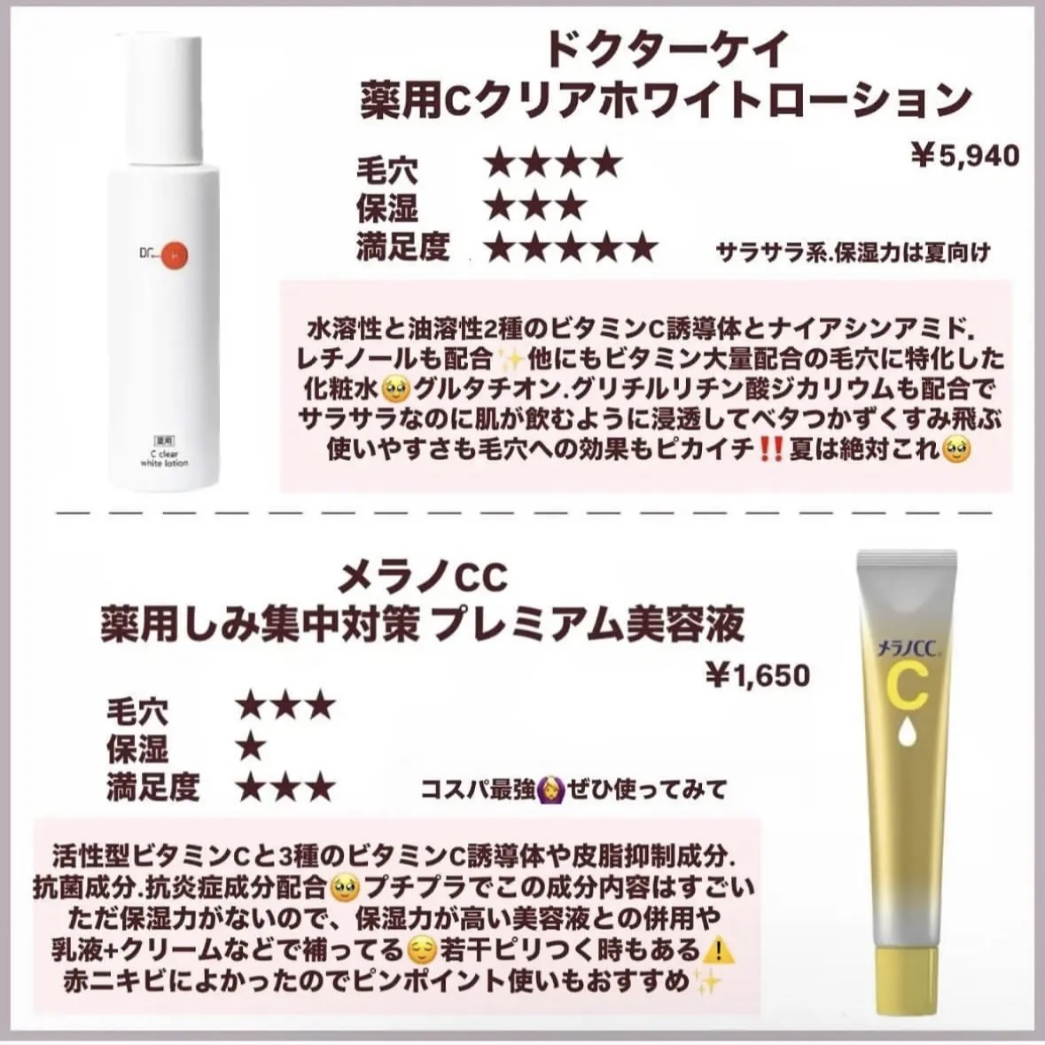 毛穴に打ち勝つおすすめ美容液紹介します🐰 朝夜で1個ずつ買いましょう! おすすめは朝ビタ.夜レチです! 美容液1つでも使うのと使わないのとでは違ってくるので自分に合う商品に出会えるように色々と試してみてくださいね🥹