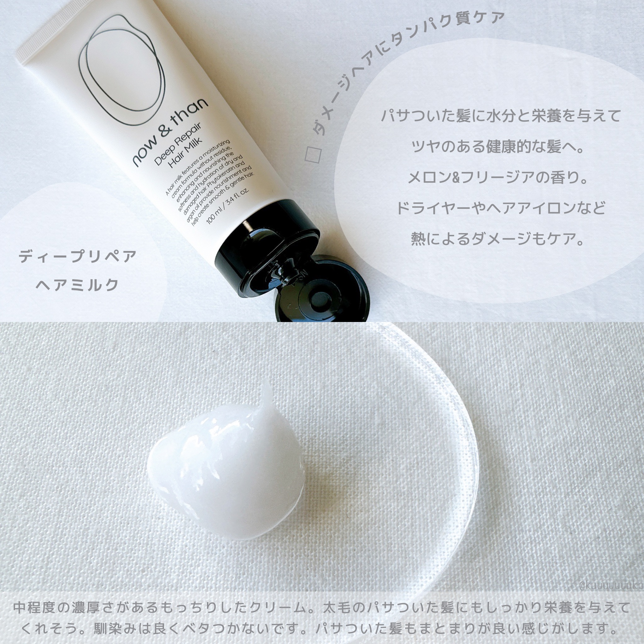 now&thanナウアンドダンディープリペアヘアミルク@now.n.than_jp様からディープリペアヘアミルクをいただきました😻ありがとうございます!タンパク質やコラーゲン成分を配合し、ダメージヘアに栄養や水分を与えてくれる洗い流さないトリ...