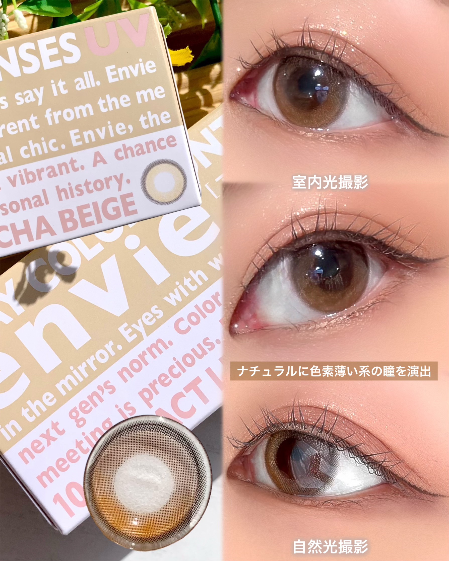 envienuanceseriesWATERMOCHABEIGEベージュニュアンスの水光感がたまらない「ウォーターモカベージュ」を装着してみました!DIA14.0mm/着色直径12.8mmで、ナチュラルだけどしっかり印象的な瞳に。水辺を映した...