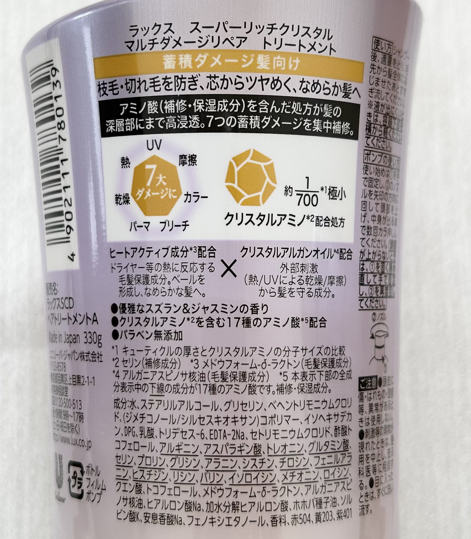 - 瞬間。クリスタルツヤ髪へ。 日常生活で受けやすい7大ダメージ(熱、摩擦、UV、カラーリング、ブリーチ、乾燥、パーマによるダメージ)を集中補修。 それを可能にした3つのLUXの先端技術。 ①約1/700*1極小クリスタルアミノ*2配合で、髪の奥まで浸透リペア ②クリスタルアルガンオイル*3配合で、外部刺激(熱/UVによる乾燥/摩擦)から徹底プロテクト。 ③髪の構成と同じ17種のアミノ酸*4配合により、まばゆいほど光をふりまくツヤ満ち髪へ。 総合的に髪の7大ダメージにアプローチするマルチダメージリペアシリーズはこんな方にオススメ! ✔髪がよく絡まるようになった ✔ツヤがなくなってきた ✔枝毛・切れ毛が気になる 枝毛・切れ毛を防ぎ、ツヤめくなめらかな髪へ導きます。 *1:キューティクルの厚さとクリスタルアミノの分子サイズの比較 *2:セリン(補修成分) *3:アルガニアスピノサ核油(毛髪保護成分) *4 アルギニン、アスパラギン酸、トレオニン、グルタミン酸、セリン、プロリン、グリシン、アラニン、シスチン、チロシン、フェニルアラニン、ヒスチジン、リシン、バリン、イソロイシン、メチオニン、ロイシン:補修・保湿成分