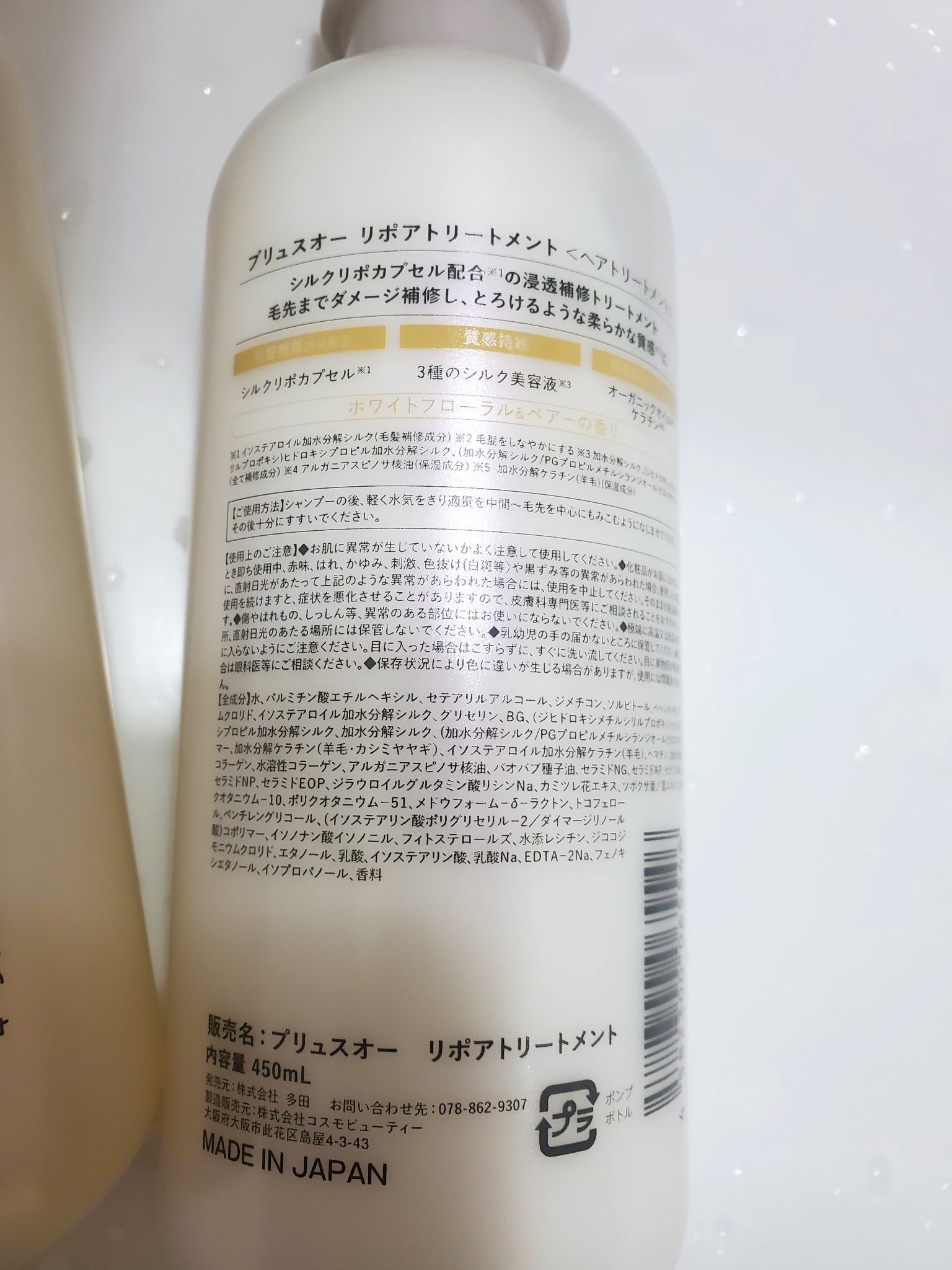 気になる香りはホワイトフローラル&ペアー💐🍐 浸透性の高い「シルクリポカプセル」配合でダメージ補修にも効果的だそうです シャンプーは泡立ちが良いのでさっぱりとした洗い心地を感じました トリートメントは塗り込んだ後のトゥルンとした感じは無かったものの、ドライヤー後にはフンワリ仕上がりました