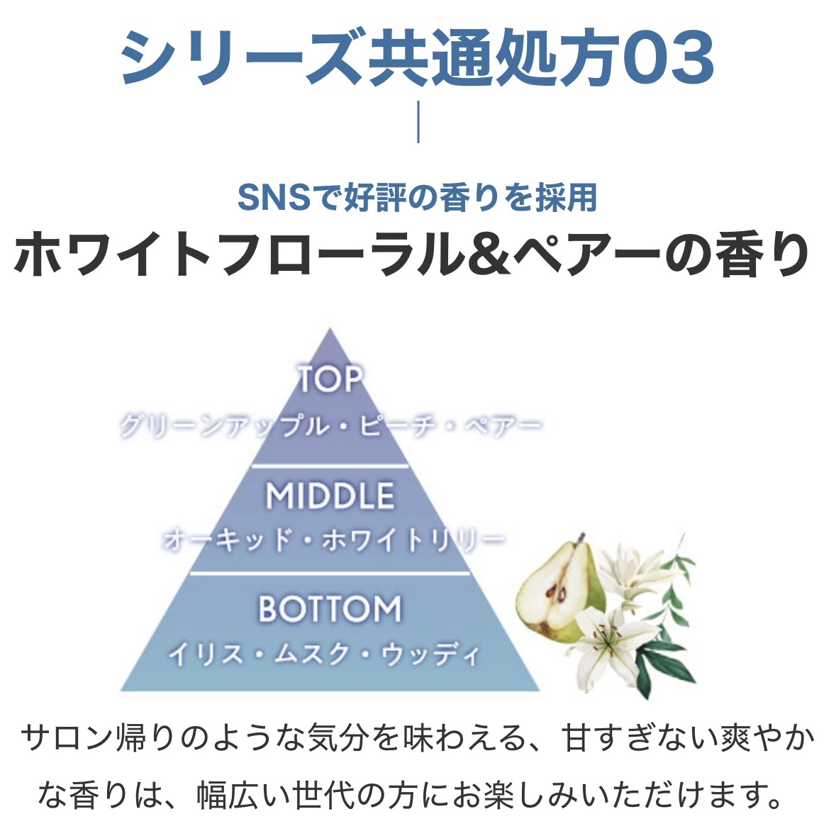 - とろけるような質感と、ダメージでパサつきがちな髪も毛先までツヤめくしっとり髪へ導く美容液シャンプー&光沢補修トリートメント。 より浸透性が高くなるカプセル化技術を採用したシルクリポカプセルを補修成分として配合。 髪の芯まで徹底補修しながらキューティクルをなめらかに整え、しっとりと潤いツヤめく髪へと導きます。 また洗いながらも髪ダメージを補修するPPT系洗浄成分を、シリーズ比で高濃度に配合。 シルク由来PPT系洗浄成分と、肌のことを考えたアミノ酸系の4種の洗浄成分とバランスよくブレンドすることでキメ細かな濃密補修泡が摩擦レスでリッチな洗い心地を実現し、髪と頭皮をいたわりながらシャンプーでも毛髪ダメージに徹底アプローチします。 カシミヤ由来のケラチンをはじめとする2種のケラチン、コラーゲン、CMC類似成分などのこだわり配合した補修成分だけでなく、美容保湿成分をたっぷり浸透させて密封補修することで、カラーや熱ダメージによるパサつき・広がり・ゴワつきなどの蓄積ダメージもしっかりケア。 ドライヤーやヘアアイロンの熱ダメージから髪を守りツヤを与える、ヒートリペア成分を配合して熱も味方に。 清楚な上品さを纏うホワイトフローラル&ペア―の香り。 2024年10月中旬 一部企業にて先行発売