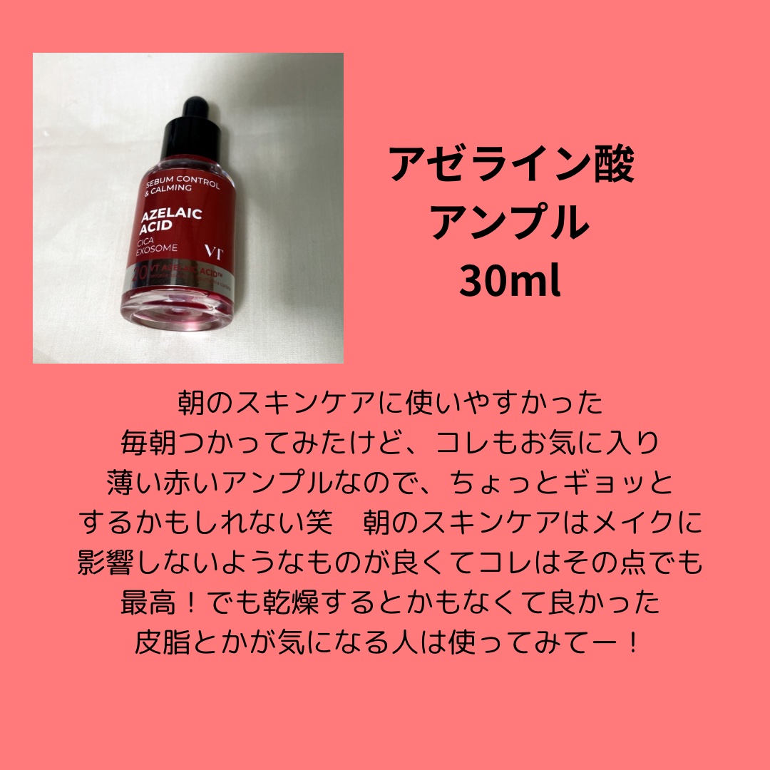 VTさんにPRでいただきました。アゼライン酸ライン3種使ってみました!①アゼライン酸トナーパッド3種使ってみて、一番お気に入りなのがコレ毎朝使ってる!フラットな面は部分パックに使って、その後軽く顔を凹凸面で拭いてるスッキリするし、朝のスキンケ...