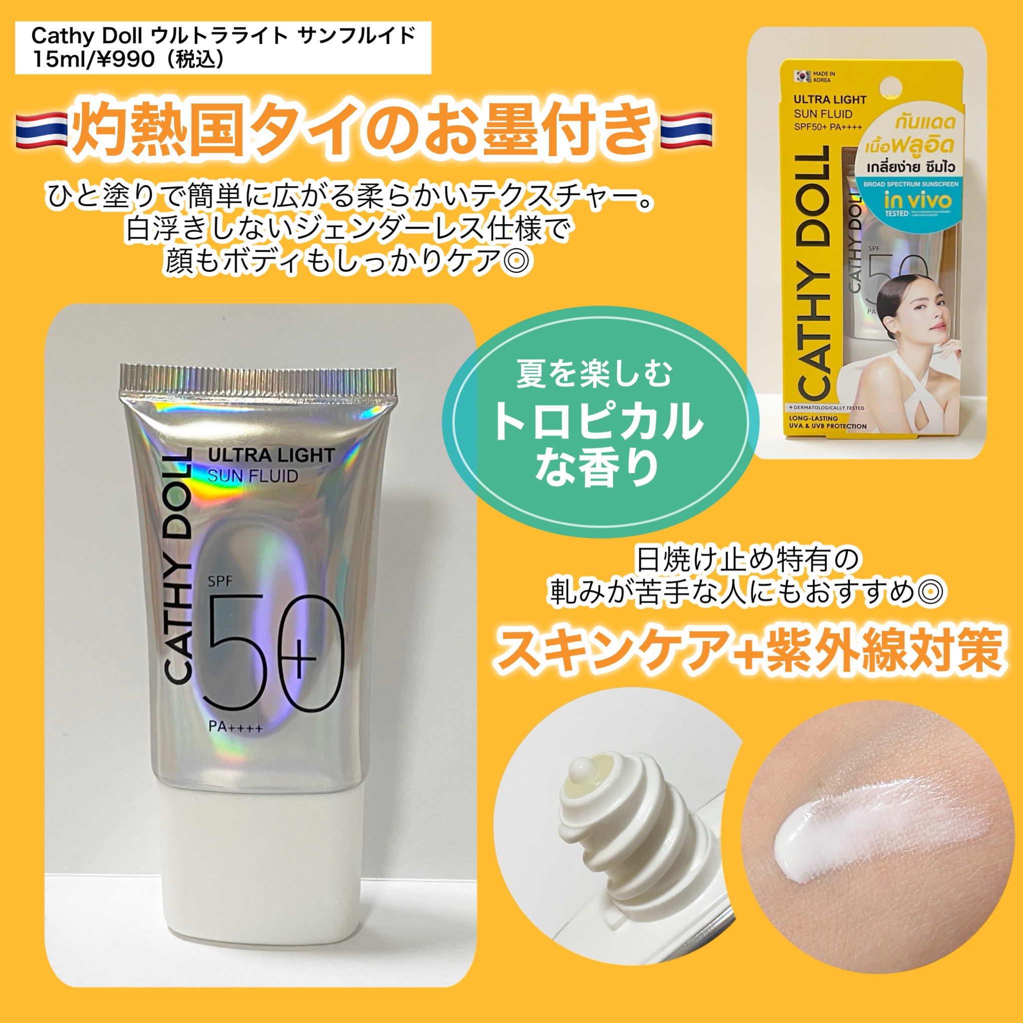 灼熱の国で愛される日焼け止め\日本上陸/CathyDollキャシードールウルトラライト サンフルイド990円(税込)SPF50PA++++アロエベラエキス配合(保湿)◯着色料・パラベン不使用◯リーフセーフ高温多湿のタイで愛される日焼け止め☀️...
