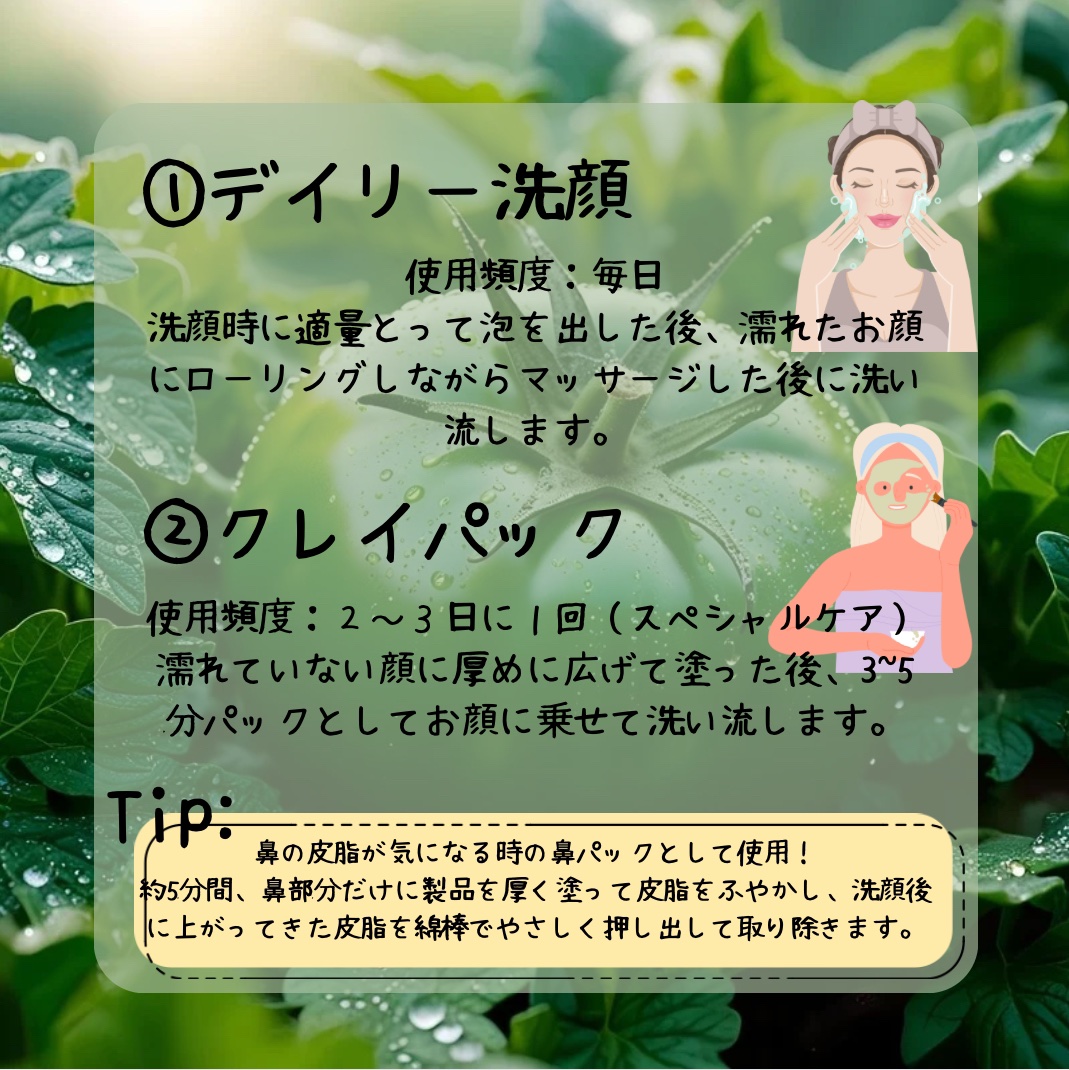 - パック+クレンジングが一度にできる 2In1 天然成分マスククレンザー! 自然のグリーントマトから抽出した純粋なエキスで 毛穴・保湿ケアしてくれます。 6種の複合クレイ+天然成分で優しい使い心地! 毛穴に留まった皮脂をケアしてきれいな肌に整えます。