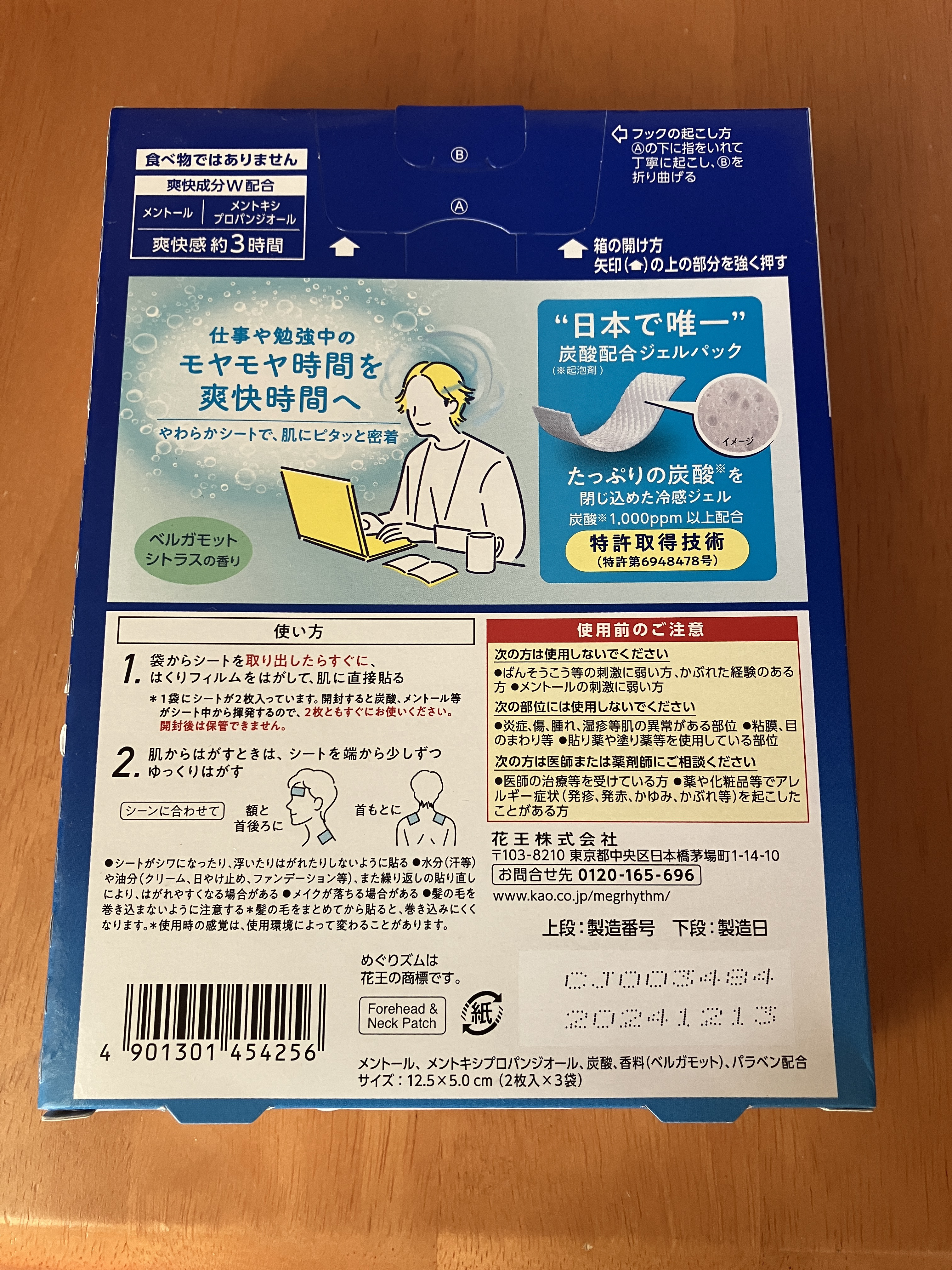 - 日本で唯一!たっぷりの炭酸(起泡剤)を閉じ込めた冷感ジェルパック。 一度貼れば、クリアな爽快感が約3時間持続。 ジュワ~ッと心地よさが広がります。 仕事や勉強中のモヤモヤ時間を爽快時間へ。 シーンに合わせて、貼り方を選べます。(額と首後ろに/首もとに) ●炭酸1,000ppm以上配合でパックやわらか ●特許取得技術(炭酸シート製造技術) ●爽快成分W配合 ●ベルガモットシトラスの香り