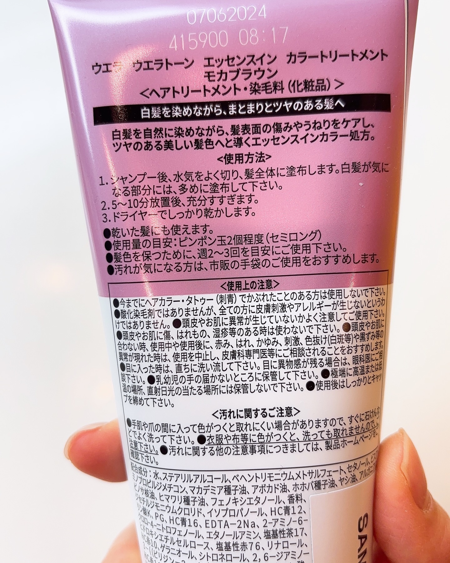 - <キャラメルブラウン> 水、ステアリルアルコール、ベヘントリモニウムメトサルフェート、セタノール、ビスアミノプロピルジメチコン、マカデミア種子油、ホホバ種子油、アボカド油、ヤシ油、アルガニアスピノサ核油、ヒマワリ種子油、フェノキシエタノール、香料、ジセチルジモニウムクロリド、イソプロパノール、HC青12、リン酸K、2−アミノ−6−クロロ−4−ニトロフェノール、PG、EDTA-2Na、エタノールアミン、ヒドロキシエチルセルロース、塩基性赤76、塩基性茶17、HC青16、リナロール、ゲラニオール、シトロネロール、HC赤10、2,6-ジアミノ-3-((ピリジン-3-イル)アゾ)ピリジン、クエン酸、HC赤11、リン酸2Na、ポリソルベート60(コムギ)、リン酸Na、トコフェロール、野菜油 <モカブラウン> 水、ステアリルアルコール、ベヘントリモニウムメトサルフェート、セタノール、ビスアミノプロピルジメチコン、マカデミア種子油、アボカド油、ホホバ種子油、ヤシ油、アルガニアスピノサ核油、ヒマワリ種子油、フェノキシエタノール、香料、ジセチルジモニウムクロリド、イソプロパノール、HC青12、リン酸K、PG、HC青16、EDTA-2Na、2−アミノ−6−クロロ−4−ニトロフェノール、エタノールアミン、塩基性茶17、ヒドロキシエチルセルロース、塩基性赤76、リナロール、HC赤10、ゲラニオール、シトロネロール、2,6-ジアミノ-3-((ピリジン-3-イル)アゾ)ピリジン、クエン酸、HC赤11、リン酸2Na、ポリソルベート60(コムギ)、リン酸Na、トコフェロール、野菜油 <アッシュブラック> 水、ステアリルアルコール、ベヘントリモニウムメトサルフェート、セタノール、ビスアミノプロピルジメチコン、マカデミア種子油、アボカド油、ホホバ種子油、ヤシ油、アルガニアスピノサ核油、ヒマワリ種子油、フェノキシエタノール、HC青12、香料、ジセチルジモニウムクロリド、イソプロパノール、リン酸K、HC青16、PG、EDTA-2Na、エタノールアミン、2−アミノ−6−クロロ−4−ニトロフェノール、ヒドロキシエチルセルロース、HC赤10、塩基性茶17、HC赤11、塩基性赤76、リナロール、ゲラニオール、シトロネロール、クエン酸、2,6-ジアミノ-3-((ピリジン-3-イル)アゾ)ピリジン、リン酸2Na、ポリソルベート60(コムギ)、リン酸Na、トコフェロール、野菜油