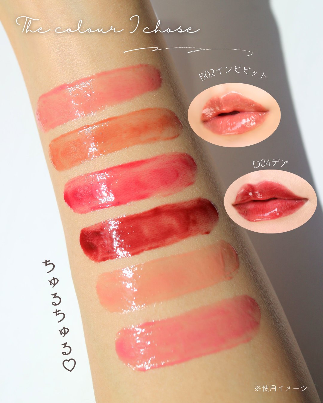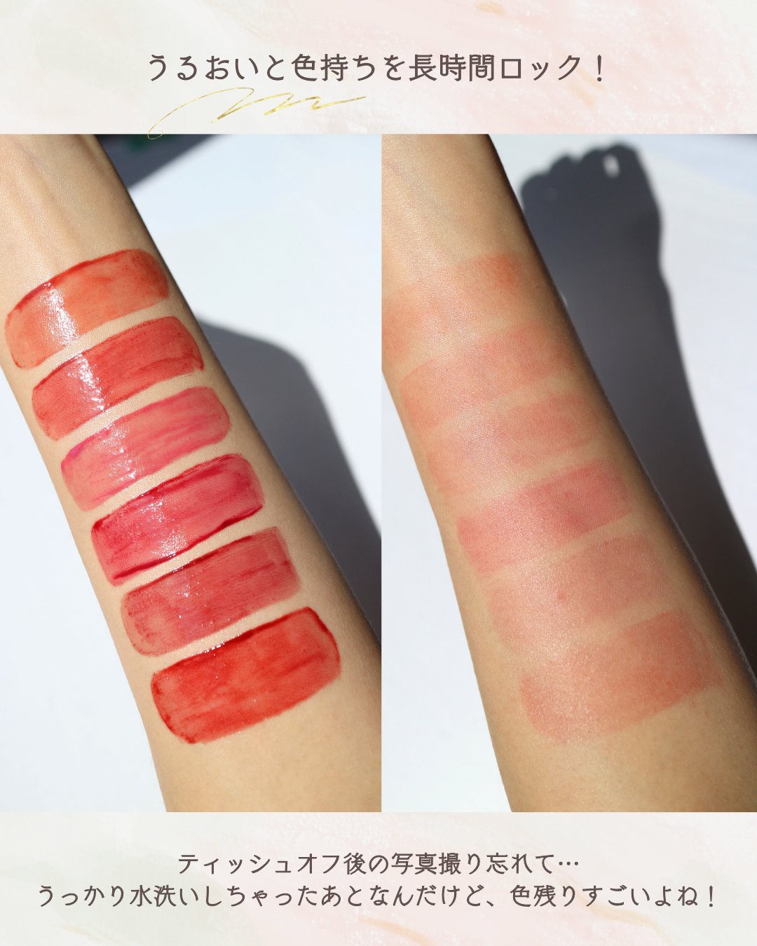 ふわふわチップで液たっぷり取れて ササッと塗って馴染むのを待つと めっちゃツヤツヤ✨ みずみずしいミラーリップだよ😍 カラーは今回5色使ったんだけど、 すべての色が発色良いし、めちゃくちゃ可愛い🥹✨ ティントなのでティッシュオフ後の色残りも有り◎