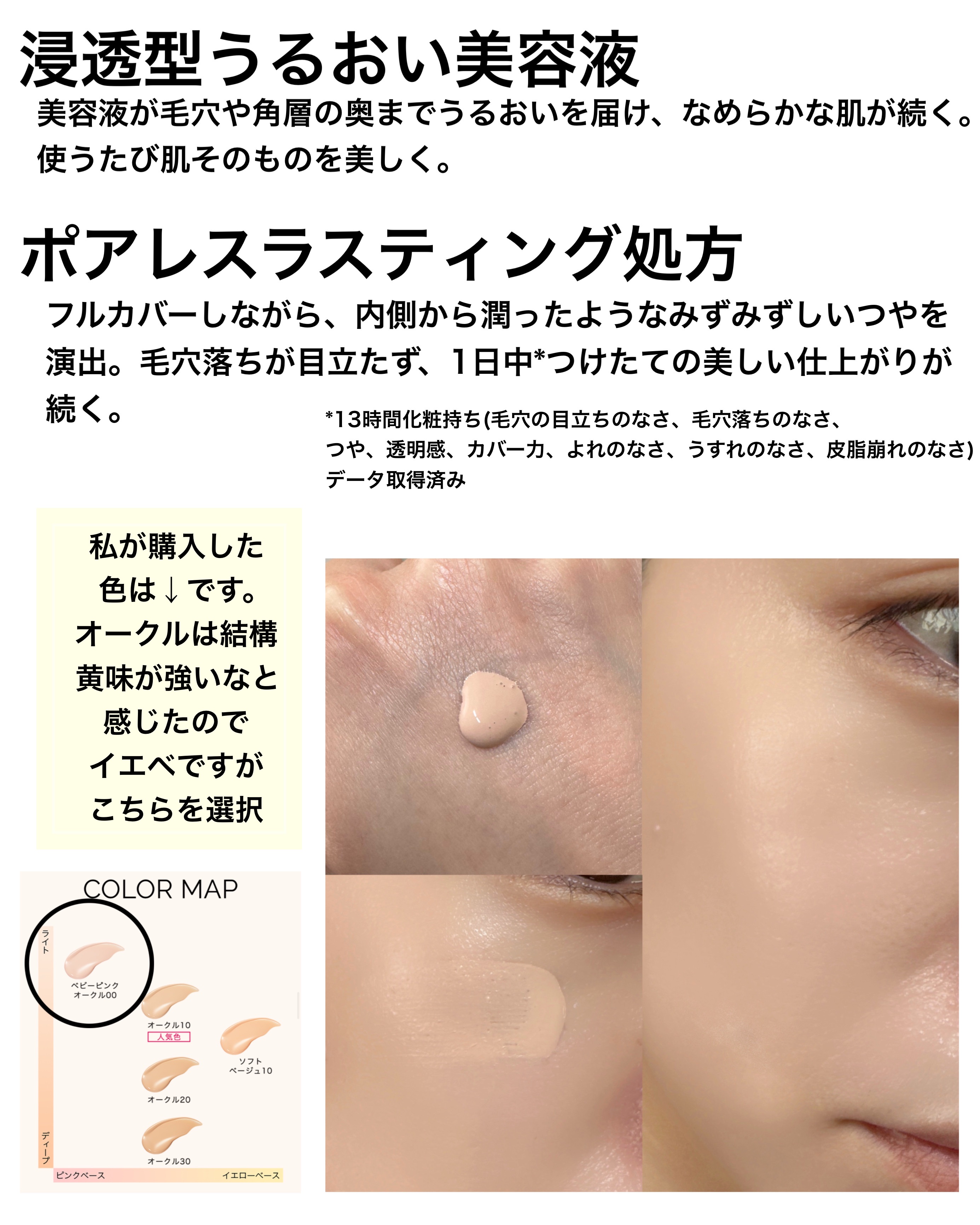 - 発売以降ずっと売上No.1*のファンデ美容液が進化! 美容保湿成分の配合量をアップ** 美容液でメイクする新発想で 使うたび、毛穴レスな「極上つるん肌」へ 【セラムファースト技術搭載】 ファンデに美容液を配合するのではなく美容液でファンデ成分をふわっとくるみ、安定的に閉じ込める、ミクロレベルのカプセル化に成功。 つけている間、ファンデではなく美容液が肌にふれ続けけます。 <POINT01>浸透型うるおい美容液 美容液が毛穴や角層までうるおいを届け、なめらかな肌が続きます。 <POINT02>ポアレスラスティング処方 フルカバーしながら、内側からうるおったようなみずみずしいつやを演出。 毛穴落ちが目立たず、1日中つけたての美しい仕上がりが続きます***。 *インテージSRI+ ファンデーション市場(リキッド形状) 期間:2022/2~2024/10 推計販売規模(金額) ブランドランキング **従来比 ***13時間化粧もち(毛穴の目立ちのなさ・毛穴落ちのなさ・つや・透明感・カバー力・よれのなさ・うすれのなさ・皮脂くずれのなさ)データ取得済み(当社調べ。効果には個人差があります。)