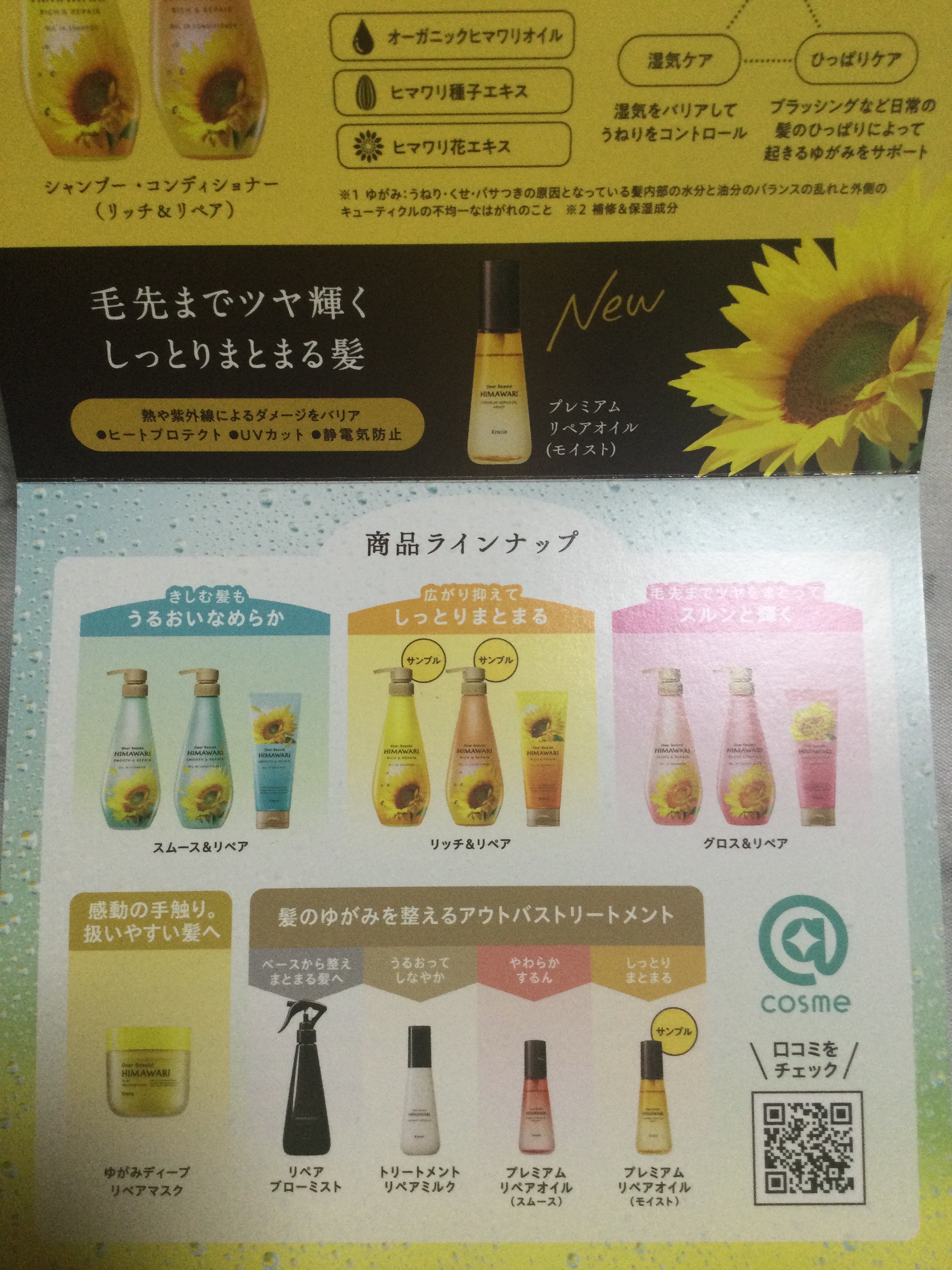 - <シャンプー本体> 水、ラウロイルサルコシンTEA、パーム核脂肪酸アミドプロピルベタイン、コカミドメチルMEA、ココイルグルタミン酸TEA、ココイルメチルタウリンNa、ヤシ油脂肪酸PEG-7グリセリル、ヒマワリ種子油、ヒマワリ種子エキス、ヒマワリ花エキス、ポリクオタニウム-7、クエン酸、セテアレス-60ミリスチルグリコール、グアーヒドロキシプロピルトリモニウムクロリド、ポリクオタニウム-10、ポリクオタニウム-49、エタノール、塩化Na、グリセリン、BG、EDTA-2Na、安息香酸Na、香料、カラメル <コンディショナー本体> 水、ラウロイルサルコシンTEA、パーム核脂肪酸アミドプロピルベタイン、コカミドメチルMEA、ココイルグルタミン酸TEA、ココイルメチルタウリンNa、ヤシ油脂肪酸PEG-7グリセリル、ヒマワリ種子油、ヒマワリ種子エキス、ヒマワリ花エキス、ポリクオタニウム-7、クエン酸、セテアレス-60ミリスチルグリコール、グアーヒドロキシプロピルトリモニウムクロリド、ポリクオタニウム-10、ポリクオタニウム-49、エタノール、塩化Na、グリセリン、BG、EDTA-2Na、安息香酸Na、香料、カラメル <シャンプー詰替> 水、ラウロイルサルコシンTEA、パーム核脂肪酸アミドプロピルベタイン、コカミドメチルMEA、ココイルグルタミン酸TEA、ココイルメチルタウリンNa、ヤシ油脂肪酸PEG-7グリセリル、ヒマワリ種子油、ヒマワリ種子エキス、ヒマワリ花エキス、ポリクオタニウム-7、クエン酸、セテアレス-60ミリスチルグリコール、グアーヒドロキシプロピルトリモニウムクロリド、ポリクオタニウム-10、ポリクオタニウム-49、エタノール、塩化Na、グリセリン、BG、EDTA-2Na、安息香酸Na、香料、カラメル <コンディショナー詰替> 水、ラウロイルサルコシンTEA、パーム核脂肪酸アミドプロピルベタイン、コカミドメチルMEA、ココイルグルタミン酸TEA、ココイルメチルタウリンNa、ヤシ油脂肪酸PEG-7グリセリル、ヒマワリ種子油、ヒマワリ種子エキス、ヒマワリ花エキス、ポリクオタニウム-7、クエン酸、セテアレス-60ミリスチルグリコール、グアーヒドロキシプロピルトリモニウムクロリド、ポリクオタニウム-10、ポリクオタニウム-49、エタノール、塩化Na、グリセリン、BG、EDTA-2Na、安息香酸Na、香料、カラメル