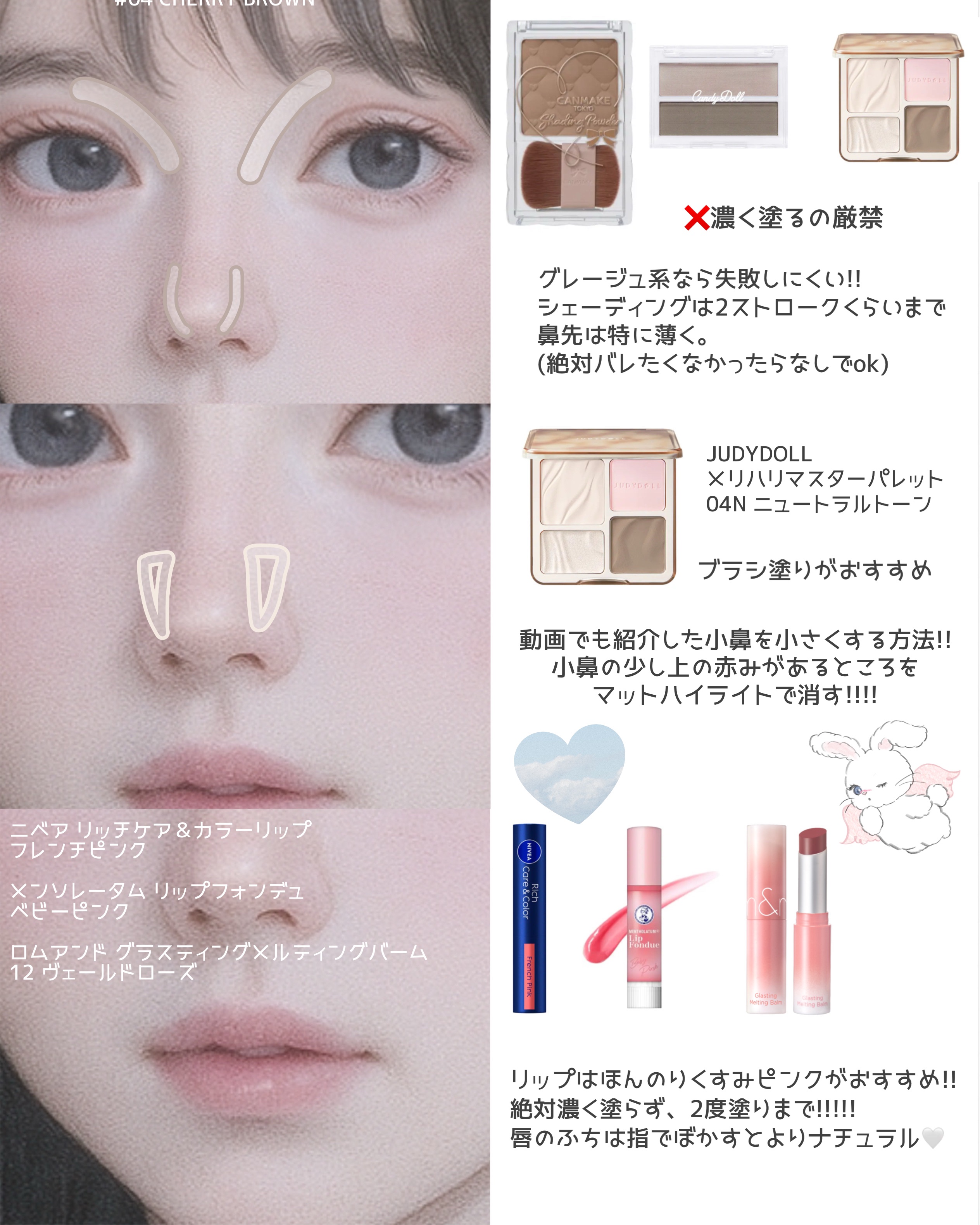 私は小さい頃から鼻が異常に低くて、眼鏡をかけても落ちてくるくらいなんです🤣 しかも、団子っ鼻で何度整形したいと思ったことか💦 ①PIPLリキッドシェーディングCL3を眉下の逆三角の窪み、鼻先に液をふちで落として薄ーく塗ってぼかす ②JUDYDOLL メリハリマスターパレット 02ウォームトーンの右上のカラーを眉下の窪みに、右下の濃いカラーを鼻筋、鼻先に塗ってぼかす