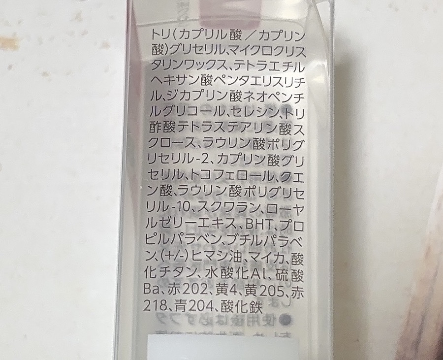 - <102 ブラウン系> トリイソステアリン酸ポリグリセリル-2、トリエチルヘキサノイン、ダイマージリノール酸ジ(イソステアリル/フィトステリル)、ポリエチレン、マイクロクリスタリンワックス、ジフェニルシロキシフェニルトリメチコン、ヘキサ(ヒドロキシステアリン酸/ステアリン酸/ロジン酸)ジペンタエリスリチル、水添ポリイソブテン、セレシン、ミリスチン酸イソセチル、ステアリルジメチコン、トコフェロール、ホホバ種子油、スクワラン、グリチルレチン酸ステアリル、ローヤルゼリーエキス、ミリスチン酸オクチルドデシル、カミツレ花エキス、クエン酸、(+/-)マイカ、黄4、酸化チタン、酸化鉄、水酸化Al、赤201、赤202、赤218、炭酸Ca、硫酸Ba <105 ブラウン系> トリイソステアリン酸ポリグリセリル-2、トリエチルヘキサノイン、ダイマージリノール酸ジ(イソステアリル/フィトステリル)、ポリエチレン、マイクロクリスタリンワックス、ジフェニルシロキシフェニルトリメチコン、ヘキサ(ヒドロキシステアリン酸/ステアリン酸/ロジン酸)ジペンタエリスリチル、水添ポリイソブテン、セレシン、ミリスチン酸イソセチル、ステアリルジメチコン、トコフェロール、ホホバ種子油、スクワラン、グリチルレチン酸ステアリル、ローヤルゼリーエキス、ミリスチン酸オクチルドデシル、カミツレ花エキス、クエン酸、(+/-)マイカ、黄4、酸化チタン、酸化鉄、水酸化Al、赤201、赤202、赤218、炭酸Ca、硫酸Ba <402 レッド系> トリイソステアリン酸ポリグリセリル-2、トリエチルヘキサノイン、ダイマージリノール酸ジ(イソステアリル/フィトステリル)、ポリエチレン、マイクロクリスタリンワックス、ジフェニルシロキシフェニルトリメチコン、ヘキサ(ヒドロキシステアリン酸/ステアリン酸/ロジン酸)ジペンタエリスリチル、水添ポリイソブテン、セレシン、ミリスチン酸イソセチル、ステアリルジメチコン、トコフェロール、ホホバ種子油、スクワラン、グリチルレチン酸ステアリル、ローヤルゼリーエキス、ミリスチン酸オクチルドデシル、カミツレ花エキス、クエン酸、(+/-)マイカ、黄4、酸化チタン、酸化鉄、水酸化Al、赤201、赤202、赤218、炭酸Ca、硫酸Ba <407 レッド系> ジイソステアリン酸ポリグリセリル-2、トリエチルヘキサノイン、マイクロクリスタリンワックス、パラフィン、カルナウバロウ、ミツロウ、トリ酢酸テトラステアリン酸スクロース、カプリン酸グリセリル、ラウリン酸ポリグリセリル-2、ラウリン酸ポリグリセリル-10、ローヤルゼリーエキス、スクワラン、クエン酸、トコフェロール、マイカ、カオリン、酸化チタン、水酸化Al、シリカ、ヒマシ油、硫酸Ba、酸化鉄、赤201、赤202、赤218、黄4、橙201、青204 <501 オレンジ系> トリイソステアリン酸ポリグリセリル-2、トリエチルヘキサノイン、ダイマージリノール酸ジ(イソステアリル/フィトステリル)、ポリエチレン、マイクロクリスタリンワックス、ジフェニルシロキシフェニルトリメチコン、ヘキサ(ヒドロキシステアリン酸/ステアリン酸/ロジン酸)ジペンタエリスリチル、水添ポリイソブテン、セレシン、ミリスチン酸イソセチル、ステアリルジメチコン、トコフェロール、ホホバ種子油、スクワラン、グリチルレチン酸ステアリル、ローヤルゼリーエキス、ミリスチン酸オクチルドデシル、カミツレ花エキス、クエン酸、(+/-)マイカ、黄4、酸化チタン、酸化鉄、水酸化Al、赤201、赤202、赤218、炭酸Ca、硫酸Ba <504 オレンジ系> トリイソステアリン酸ポリグリセリル-2、トリエチルヘキサノイン、ダイマージリノール酸ジ(イソステアリル/フィトステリル)、ポリエチレン、マイクロクリスタリンワックス、ジフェニルシロキシフェニルトリメチコン、ヘキサ(ヒドロキシステアリン酸/ステアリン酸/ロジン酸)ジペンタエリスリチル、水添ポリイソブテン、セレシン、ミリスチン酸イソセチル、ステアリルジメチコン、トコフェロール、ホホバ種子油、スクワラン、グリチルレチン酸ステアリル、ローヤルゼリーエキス、ミリスチン酸オクチルドデシル、カミツレ花エキス、クエン酸、(+/-)マイカ、黄4、酸化チタン、酸化鉄、水酸化Al、赤201、赤202、赤218、炭酸Ca、硫酸Ba <505 オレンジ系> トリイソステアリン酸ポリグリセリル-2、トリエチルヘキサノイン、ダイマージリノール酸ジ(イソステアリル/フィトステリル)、ポリエチレン、マイクロクリスタリンワックス、ジフェニルシロキシフェニルトリメチコン、ヘキサ(ヒドロキシステアリン酸/ステアリン酸/ロジン酸)ジペンタエリスリチル、水添ポリイソブテン、セレシン、ミリスチン酸イソセチル、ステアリルジメチコン、トコフェロール、ホホバ種子油、スクワラン、グリチルレチン酸ステアリル、ローヤルゼリーエキス、ミリスチン酸オクチルドデシル、カミツレ花エキス、クエン酸、(+/-)マイカ、黄4、酸化チタン、酸化鉄、水酸化Al、赤201、赤202、赤218、炭酸Ca、硫酸Ba <205 ピンク系> トリ(カプリル酸/カプリン酸)グリ