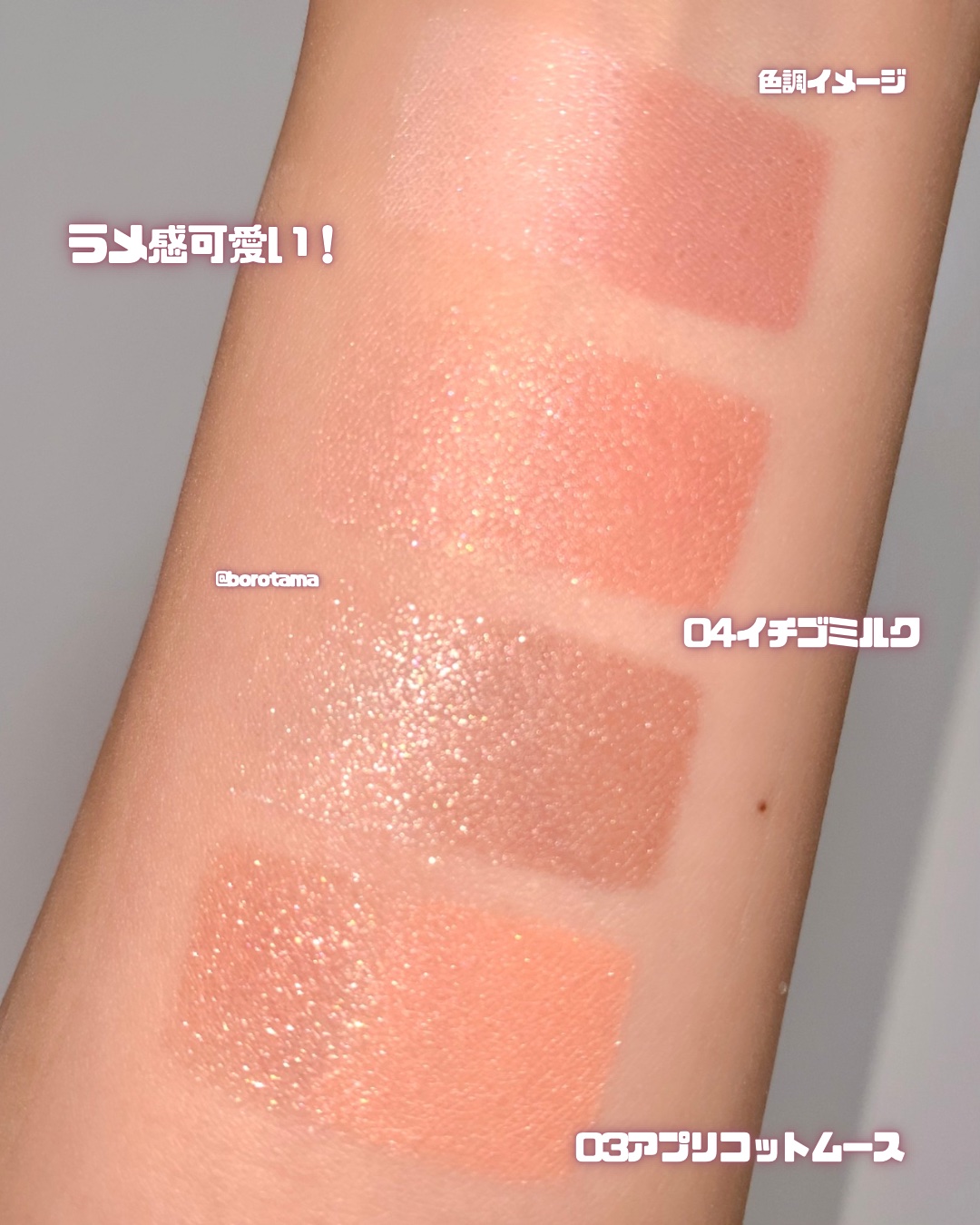 - <03 アプリコットムース> 左上 フェニルトリメチコン、トリイソステアリン酸ポリグリセリル-2、ヘキサ(ヒドロキシステアリン酸/ステアリン酸/ロジン酸)ジペンタエリスリチル、リンゴ酸ジイソステアリル、ミリスチン酸亜鉛、窒化ホウ素、ペンチレングリコール、フェノキシエタノール、メチルパラベン、トコフェロール、ホホバ種子油、メドウフォーム油、アボカド油、ホウケイ酸(Ca/チタン)、タルク、ホウケイ酸(Ca/Na)、合成フルオロフロゴパイト、酸化チタン、酸化鉄、酸化鉄、酸化鉄、酸化スズ、マンガンバイオレット、水酸化Al 右上 トリイソステアリン酸ポリグリセリル-2、メタクリル酸メチルクロスポリマー、リンゴ酸ジイソステアリル、窒化ホウ素、トリエチルヘキサノイン、ミリスチン酸亜鉛、ヘキサ(ヒドロキシステアリン酸/ステアリン酸/ロジン酸)ジペンタエリスリチル、ペンチレングリコール、ビスジグリセリルポリアシルアジペート-2、フェノキシエタノール、メチルパラベン、トコフェロール、ホホバ種子油、メドウフォーム油、アボカド油、合成フルオロフロゴパイト、タルク、酸化チタン、酸化スズ、酸化鉄、酸化鉄、酸化鉄、水酸化Al 左下 トリイソステアリン酸ポリグリセリル-2、フェニルトリメチコン、リンゴ酸ジイソステアリル、ミリスチン酸亜鉛、窒化ホウ素、ペンチレングリコール、フェノキシエタノール、メチルパラベン、トコフェロール、ホホバ種子油、メドウフォーム油、アボカド油、合成フオロフロゴパイト、タルク、酸化チタン、マイカ、酸化鉄、酸化鉄、酸化鉄、水酸化Al、酸化スズ 右下 トリイソステアリン酸ポリグリセリル-2、フェニルトリメチコン、リンゴ酸ジイソステアリル、ミリスチン酸亜鉛、窒化ホウ素、ペンチレングリコール、フェノキシエタノール、メチルパラベン、トコフェロール、ホホバ種子油、メドウフォーム油、アボカド油、合成フルオロフロゴパイト、タルク、酸化鉄、酸化鉄、酸化鉄、酸化チタン、グンジョウ、水酸化Al <04 イチゴミルク> 左上 トリイソステアリン酸ポリグリセリル-2、リンゴ酸ジイソステアリル、メタクリル酸メチルクロスポリマー、窒化ホウ素、トリエチルヘキサノイン、ミリスチン酸亜鉛、ヘキサ(ヒドロキシステアリン酸/ステアリン酸/ロジン酸)ジペンタエリスリチル、ペンチレングリコール、ビスジグリセリルポリアシルアジペート-2、フェノキシエタノール、メチルパラベン、トコフェロール、ホホバ種子油、メドウフォーム油、アボカド油、合成フルオロフロゴパイト、タルク、酸化チタン、マンガンバイオレット、酸化鉄、酸化鉄、酸化スズ、水酸化Al 右上 トリイソステアリン酸ポリグリセリル-2、メタクリル酸メチルクロスポリマー、リンゴ酸ジイソステアリル、窒化ホウ素、トリエチルヘキサノイン、ミリスチン酸亜鉛、ヘキサ(ヒドロキシステアリン酸/ステアリン酸/ロジン酸)ジペンタエリスリチル、ペンチレングリコール、ビスジグリセリルポリアシルアジペート-2、フェノキシエタノール、メチルパラベン、トコフェロール、ホホバ種子油、メドウフォーム油、アボカド油、合成フルオロフロゴパイト、タルク、酸化チタン、マンガンバイオレット、酸化スズ、水酸化Al、酸化鉄 左下 トリイソステアリン酸ポリグリセリル-2、フェニルトリメチコン、リンゴ酸ジイソステアリル、ミリスチン酸亜鉛、窒化ホウ素、ペンチレングリコール、フェノキシエタノール、メチルパラベン、トコフェロール、ホホバ種子油、メドウフォーム油、アボカド油、マイカ、タルク、合成フルオロフロゴパイト、酸化鉄、酸化チタン、マンガンバイオレット、水酸化Al、酸化スズ、グンジョウ 右下 トリイソステアリン酸ポリグリセリル-2、メタクリル酸メチルクロスポリマー、リンゴ酸ジイソステアリル、窒化ホウ素、トリエチルヘキサノイン、ミリスチン酸亜鉛、ヘキサ(ヒドロキシステアリン酸/ステアリン酸/ロジン酸)ジペンタエリスリチル、ペンチレングリコール、ビスジグリセリルポリアシルアジペート-2、フェノキシエタノール、メチルパラベン、トコフェロール、ホホバ種子油、メドウフォーム油、アボカド油,合成フルオロフロゴパイト、タルク、酸化鉄、酸化チタン、マンガンバイオレット、グンジョウ、水酸化Al