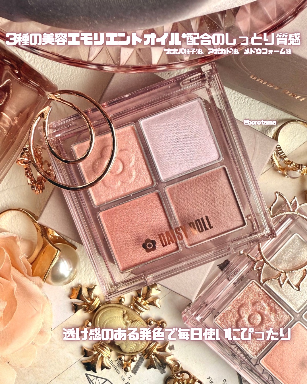 \誰でも似合う究極の4色パレット/DAISYDOLLbyMARYQUANTデイジードールアイドローシャドウ03アプリコットムース透け感のある発色と輝きを兼ね備えたカラーで立体的なグラデが完成!!ほんのり透ける明るめコーラルカラーが今っぽくて可...