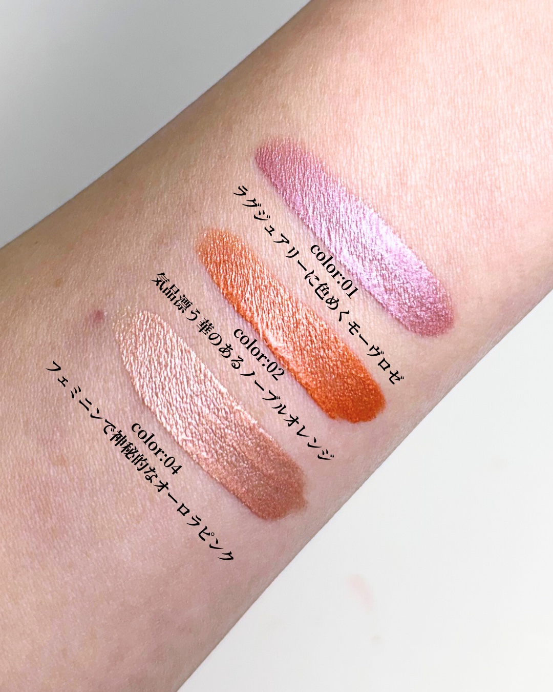 ツヤ好きにはたまらない濡れツヤ感と繊細パールの上品さ🥺💎 02 ノーブルオレンジは絶対ほしかった大本命カラー🍊 高発色、華やかなオレンジでイエベ春の良さを引き出してくれる😳🫶 この2色を重ねると多幸感爆上がります🫣🌸