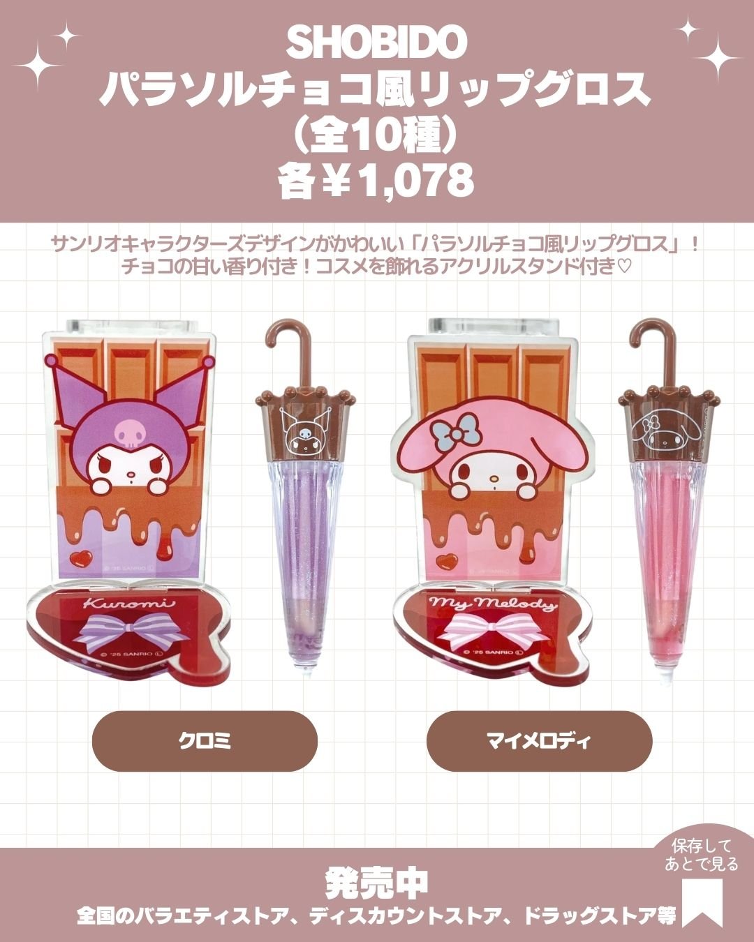 - 唇にツヤと潤いをあたえるリップグロス。塗っても色はつきません。 (ハローキティのみ赤く色づきます) *ブラインド仕様 *チョコの香り *コスメを飾れるアクリルスタンド付