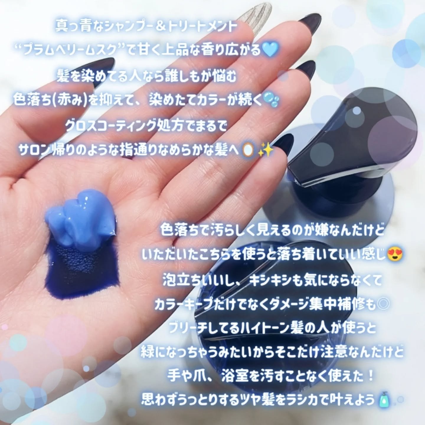 泡立ちが良くパサついたりキシんだりしない使い心地◎ ダークブルーのようなカラーだけど、使ってみると泡はほんのり色づいている感じ! 香りも良くツヤも感じられてとっても嬉しい! 絡まずなめらかでツヤ感も感じる使い心地です🤍.*