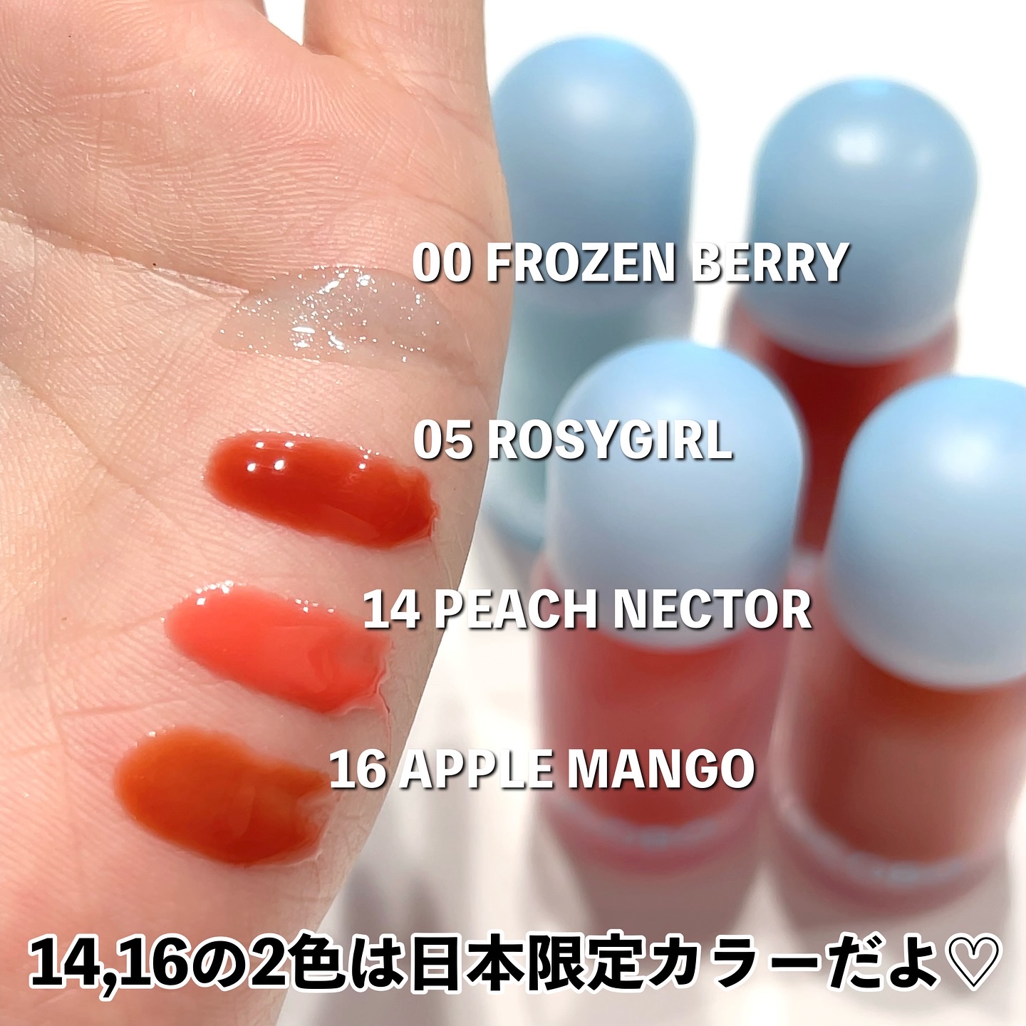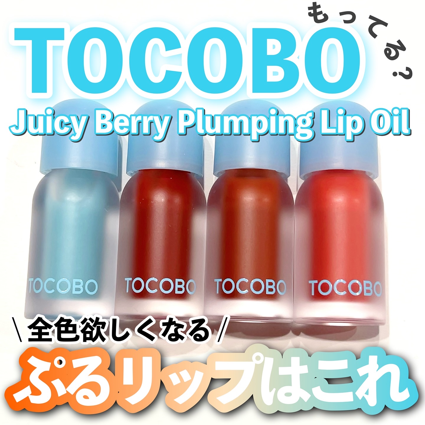 @tocobo_jpジューシーベリープランピングリップオイルガラス玉のようなツヤツヤなくちびるになれるリップオイル00フローズンベリーはクリアカラー05ロージーガールはコーラル系の色味でイエベさんに似合いそうなカラー14ピーチネクターは可愛ら...