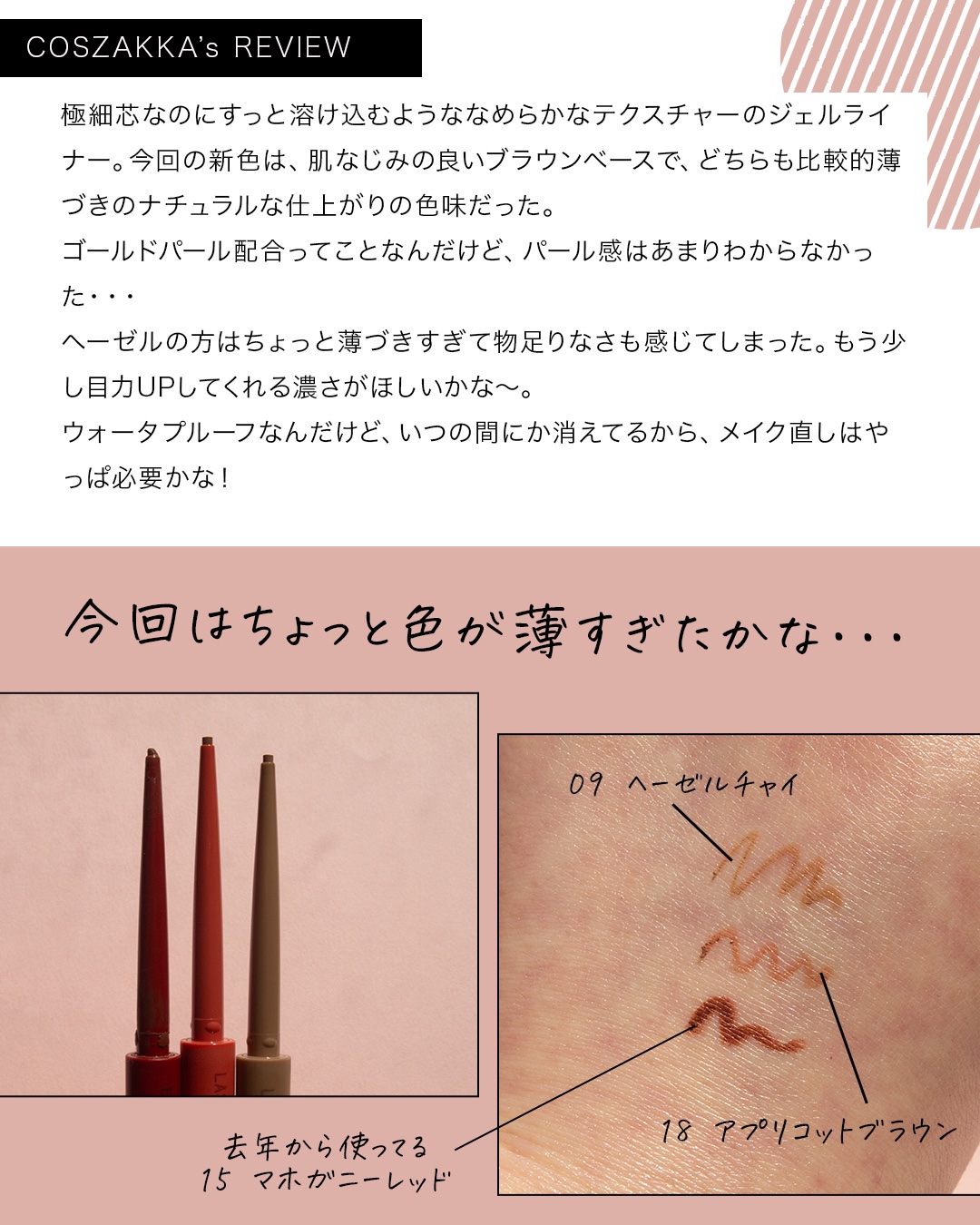 LIPS購入品❤ettusaisエテュセラスティングジェルライナー★09ヘーゼルチャイ若干の黄色みですが、ブルベさんも使えそう★14ルミナスポピー赤み多めのピンク。可愛い★16テラコッタオレンジ黄色みしっかりオレンジブラウン擦っても落ちにくい...