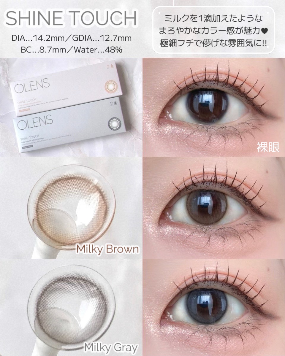 \OLENS新作デカ目カラコン比較🫶🏼🖤/▷OLENS■RealishGray、Brown🆕1Day(1箱10枚入り)DIA14.5mmGDIA13.5mmWATER48%透明感のあるトーンアップカラーと太フチでラブリーな目元を演出する#デカ...