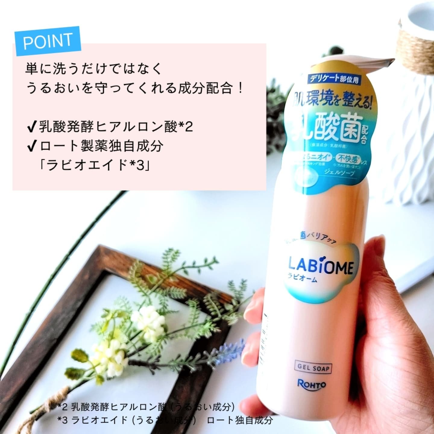 - 乳酸菌(保湿成分)*6配合のとろみのあるジェルが、うるおい守りながら、ニオイ・不快感の原因にもなりうる汚れをすっきり落とし、デリケート部位の肌環境を整えます。 ① ロート独自成分 乳酸発酵ヒアルロン酸*7(保湿成分)、乳酸菌*6(保湿成分)、ラビオエイド*8(保湿成分)を配合。 ②デリケートな部位へのやさしさにこだわった処方。 弱酸性、防腐剤フリー、敏感肌の方のご協力によるパッチテスト済(すべての方に刺激が起こらないというわけではございません。) ③清々しいフローラルの香り。ニオイベール効果で気になるニオイをケア。 *6:乳酸桿菌、*7:乳酸球菌、ヒアルロン酸発酵液、*8:ボンバクスコスタツム花エキス 先行発売:2024年12月3日(火)より順次、ECサイト(Amazon、楽天、LOHACO、@cosme SHOPPING)