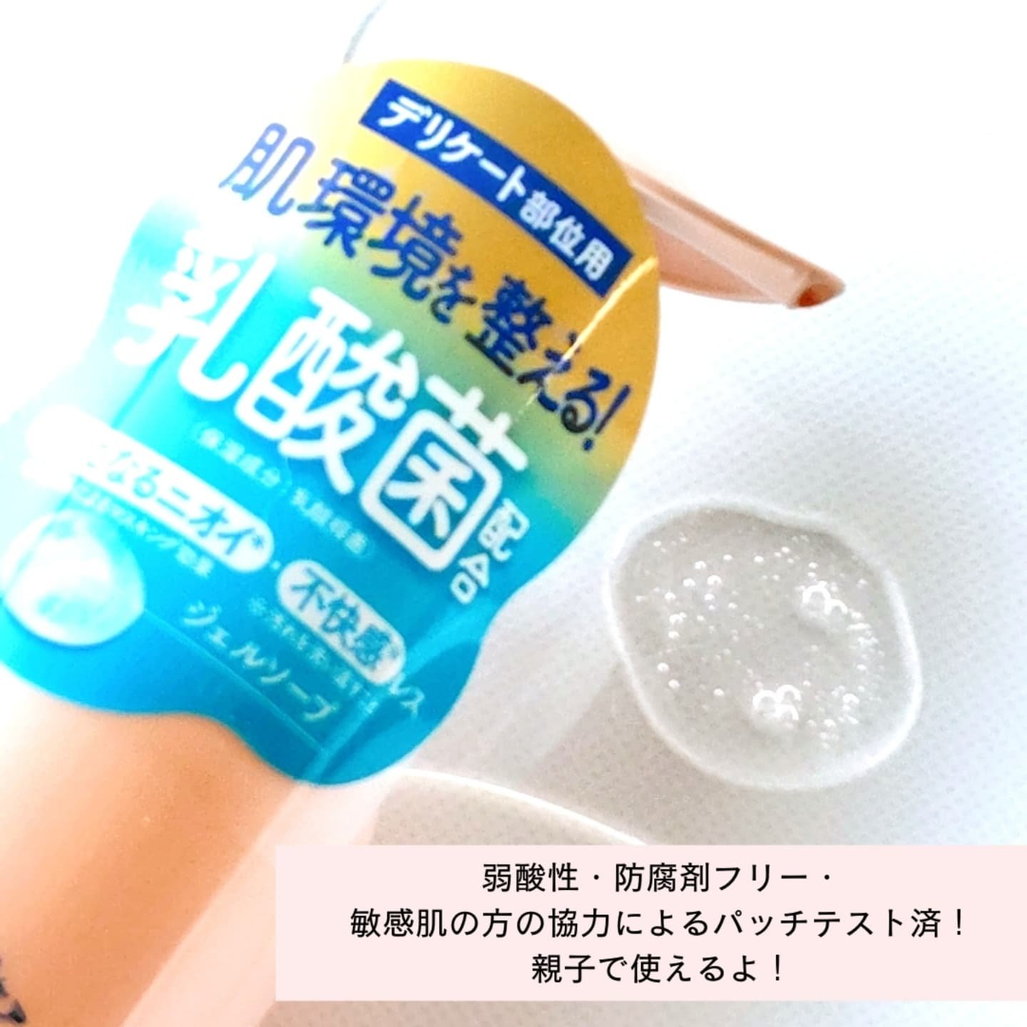 乳酸菌(うるおい成分)バリアケア発想で作られたジェルタイプのソープ☺️ うるおい成分「乳酸菌」「乳酸発酵ヒアルロン酸」が配合でデリケートゾーンの肌環境を整えてくれるよ✨ デリケート部位に合わせた弱酸性なのもポイント☺️