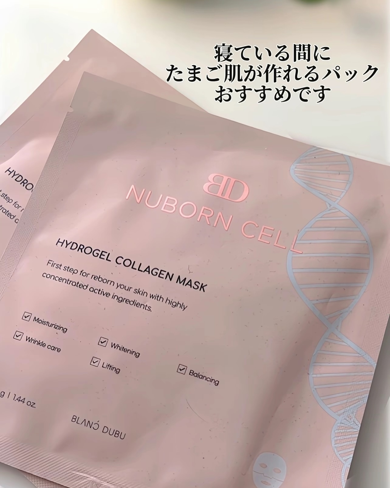 BLANCDUBU/NUBORNCELLHYDROGELCOLLAGENMASK貼っている間にコラーゲンを吸収して白⇒透明になるおもしろいパック6時間貼りっぱなしで、寝てしまっても大丈夫な便利なパック💤シートも丈夫なので破けません♪ほんのり良...