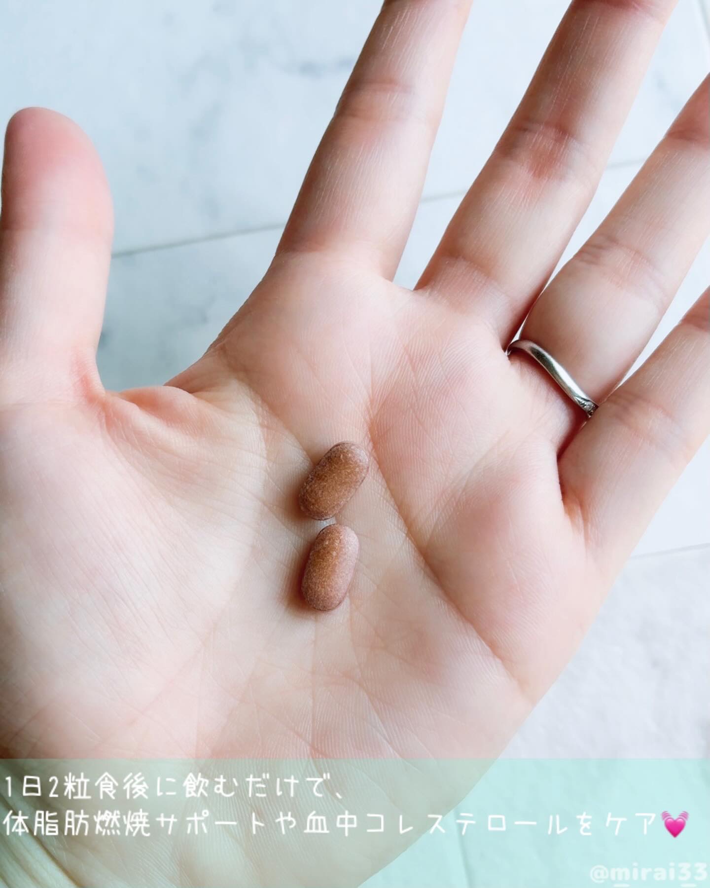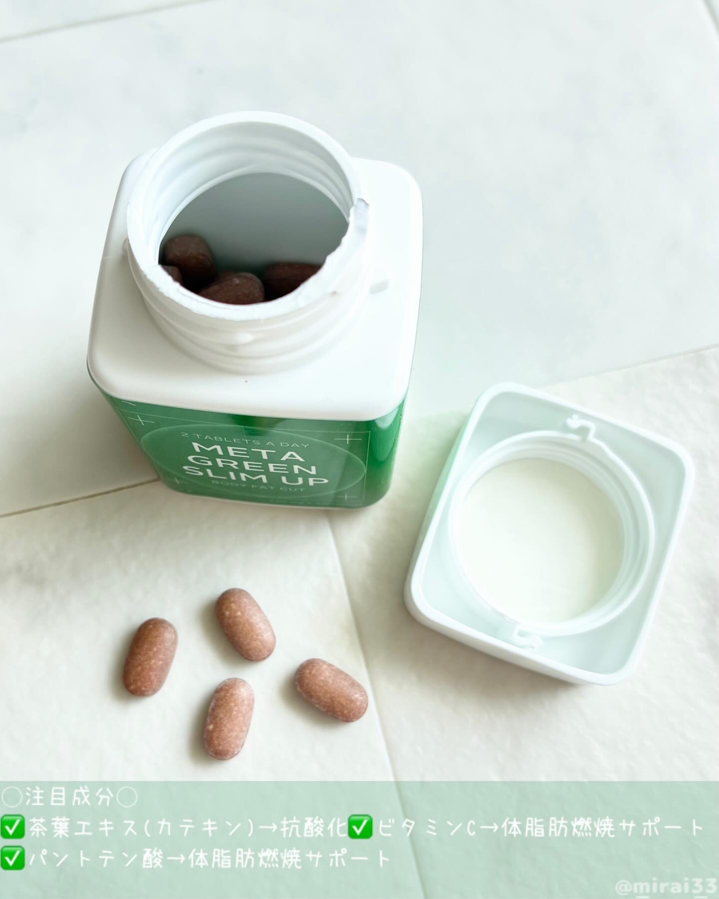 体脂肪の減少を手伝ってくれる緑茶カテキン高配合されているため、食事後の脂肪の吸収を抑えて、排出を手伝ってくれる商品🍵 サプリに腸溶性コーティングがされているので、口の中で溶けたりしません。サラサラとした表面で大きさもちょうど良いので喉に引っかからずすごく飲みやすい。 飲むのも1日2粒なので、私は朝晩と分けているし、こういう面でも飲みやすく感じています。