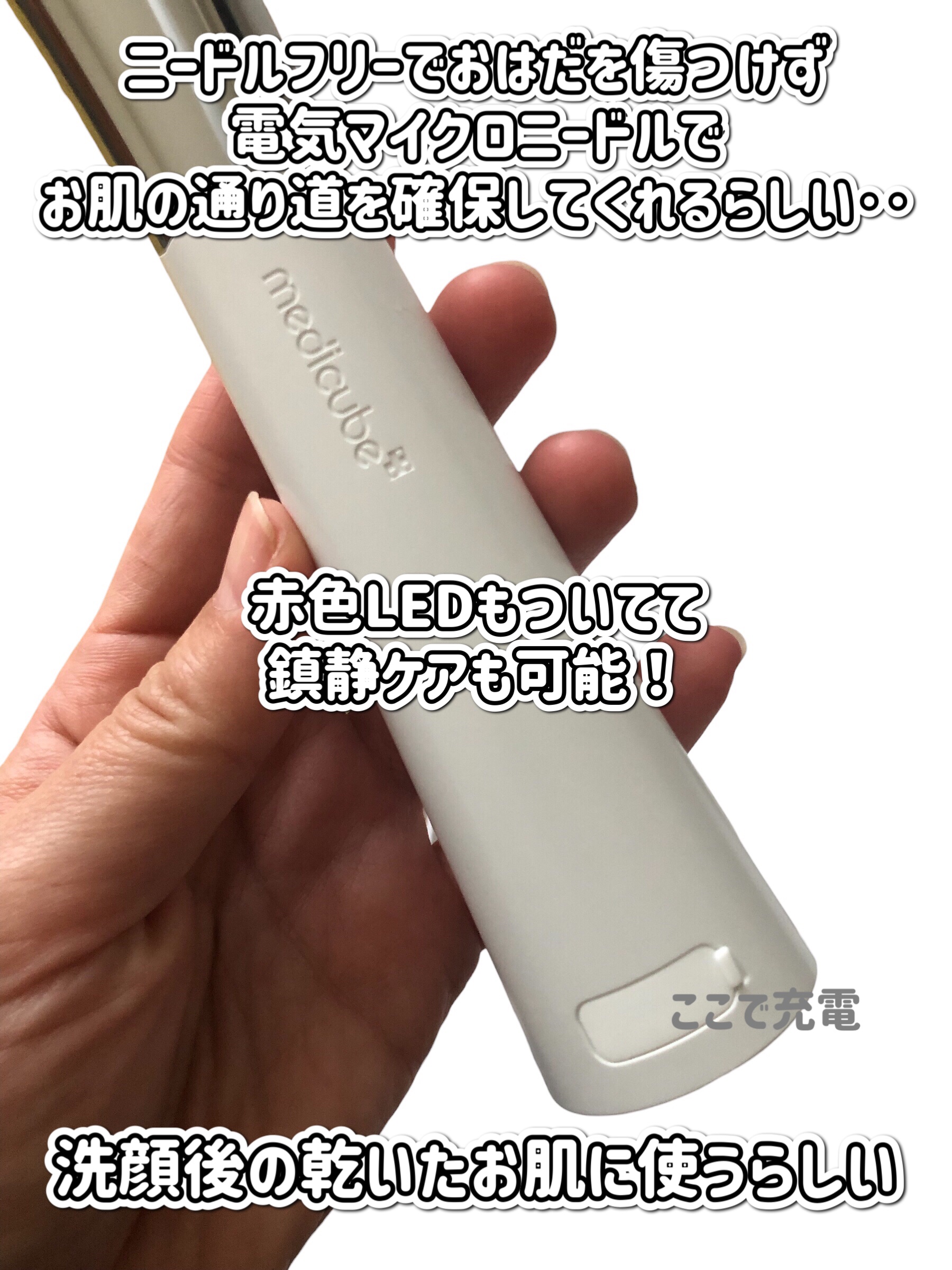 - #針を使用せず、やさしい使い心地で毛穴*1・ハリケア 電気マイクロニードルによって、毛穴*1・ハリケアをする美顔器です。高電圧の電気を短時間で照射し、肌に刺激の少ない使い心地で角質層への浸透をサポート、肌を引き締めることで毛穴の目立ちにくい肌に導きます。スキンケアの浸透*2しやすい肌に仕上げます。 ☑RED LED使用:Toning Poration™【弾力・ハリケア】 ☑スキンケア吸収率4.3倍 *3 ☑週1~2回のスペシャルケアとしての使用推奨 ☑ボタンひとつだけの簡単操作 ☑5段階レベル設定(1段階から徐々に段階を上げて使用してください) ☑音声案内機能(1分ごとに時間案内) ☑充電1回で4週間使用可能(1日1回使用した場合) ☑スマートフォンより軽い80g *1 肌を引き締めて毛穴を目立ちにくくさせること *2 角質層まで *3 手で塗布した場合との比較(当社調べ メディキューブAGE-Rエアショット測定報告書より)