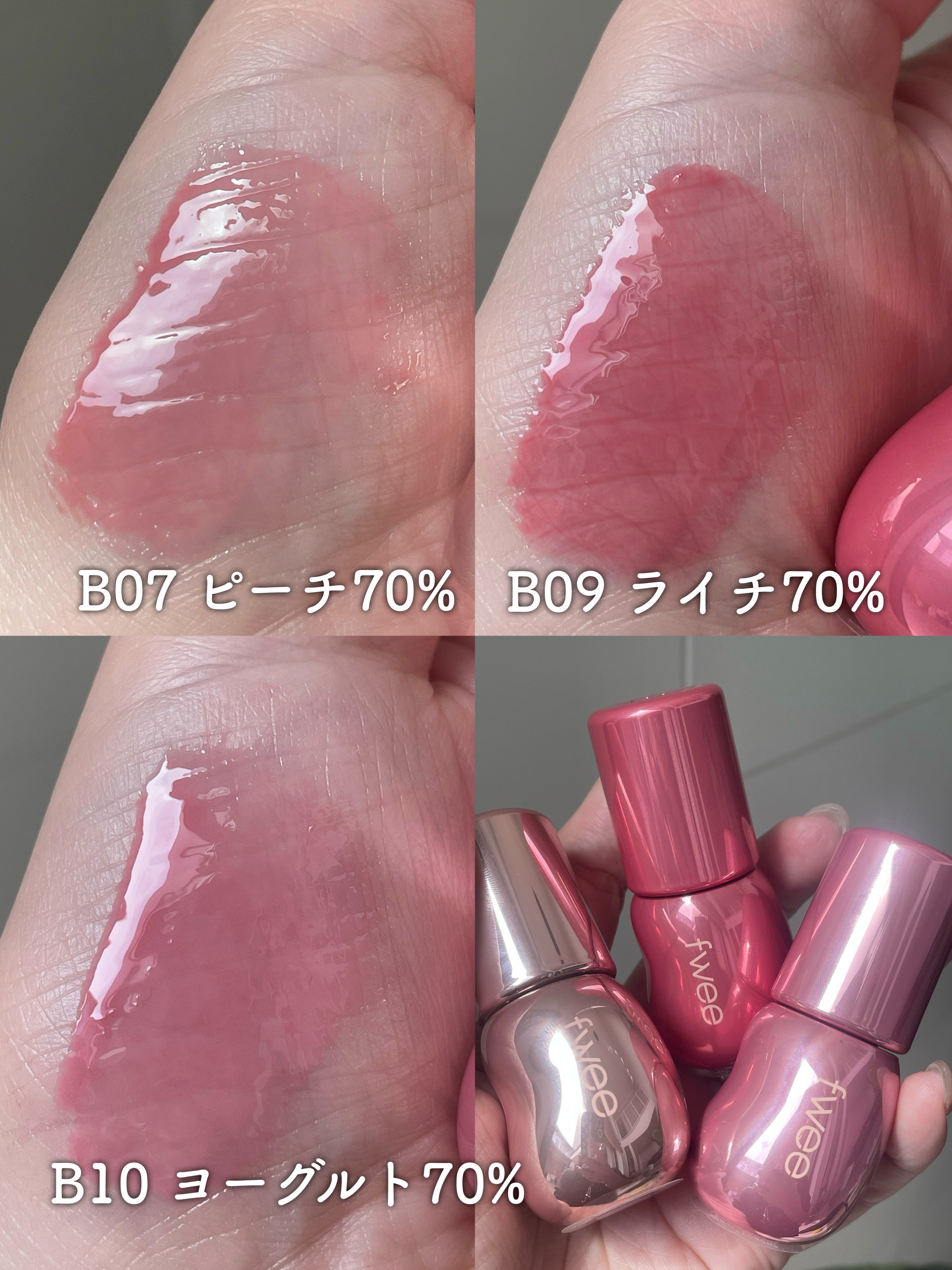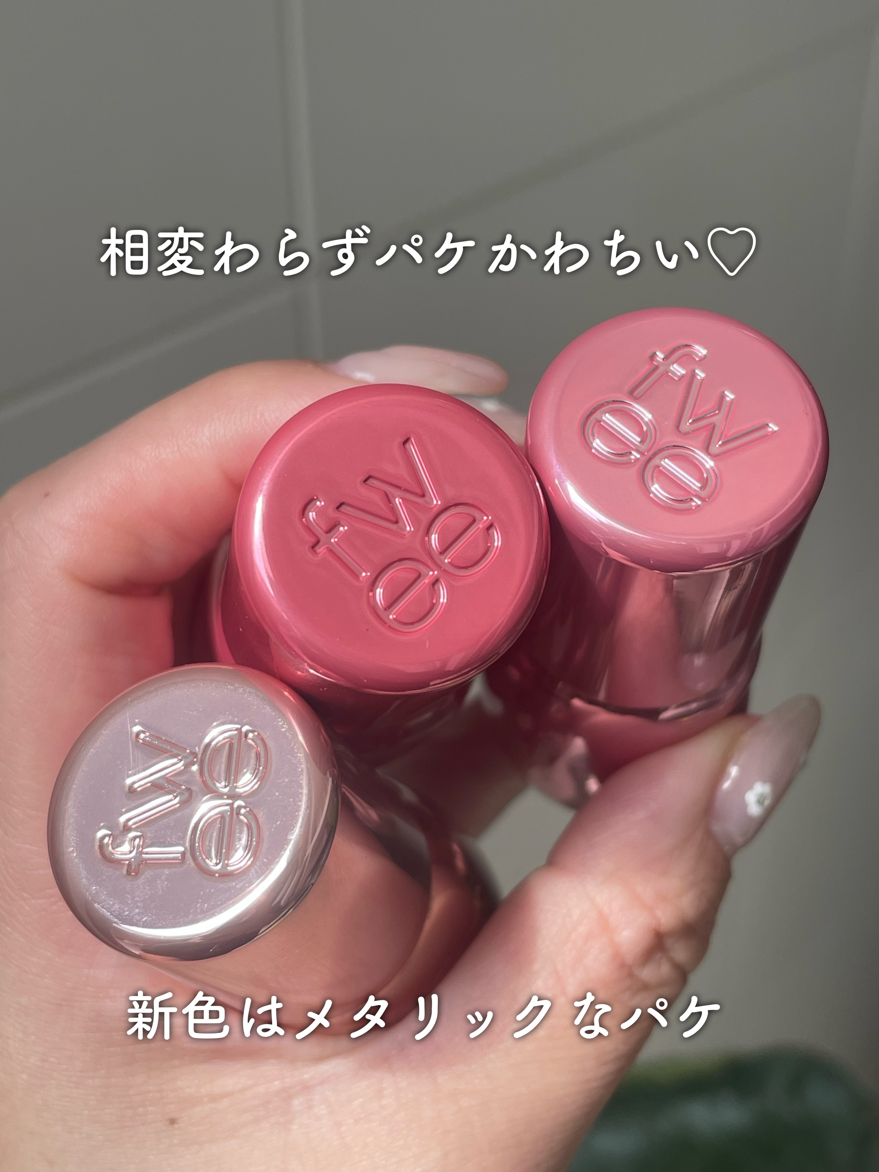 韓国コスメ、fweeのリップグロス✨ 好きすぎて、また追加で購入したので手持ちのカラーをスウォッチしました💕 カラー展開がとにかく可愛くて、全色欲しくなる勢い✨ 唇が乾燥することもないし、仕上がりに立体感が出てぷるぷるになるのでおすすめです💕