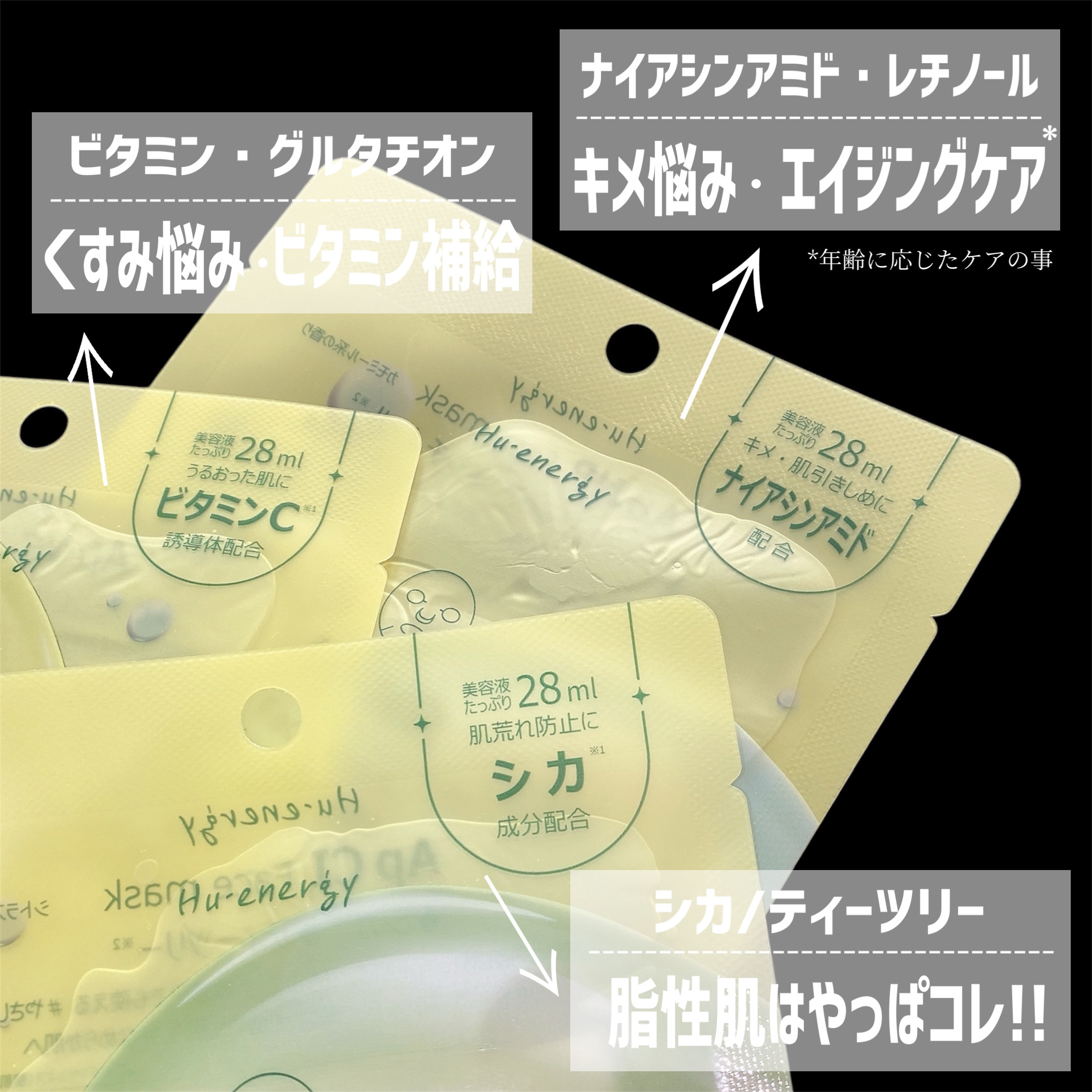 HuEnergyアンプルフェイスマスクシートマスク🤍特徴🤍お肌悩みで選べるフェイスマスク!✔️ApCI(CICA・TEATREE) 鎮静・抗炎症ケア/シトラスの香り✔️ApHC(Collagen・AcidHyaluronic) ...