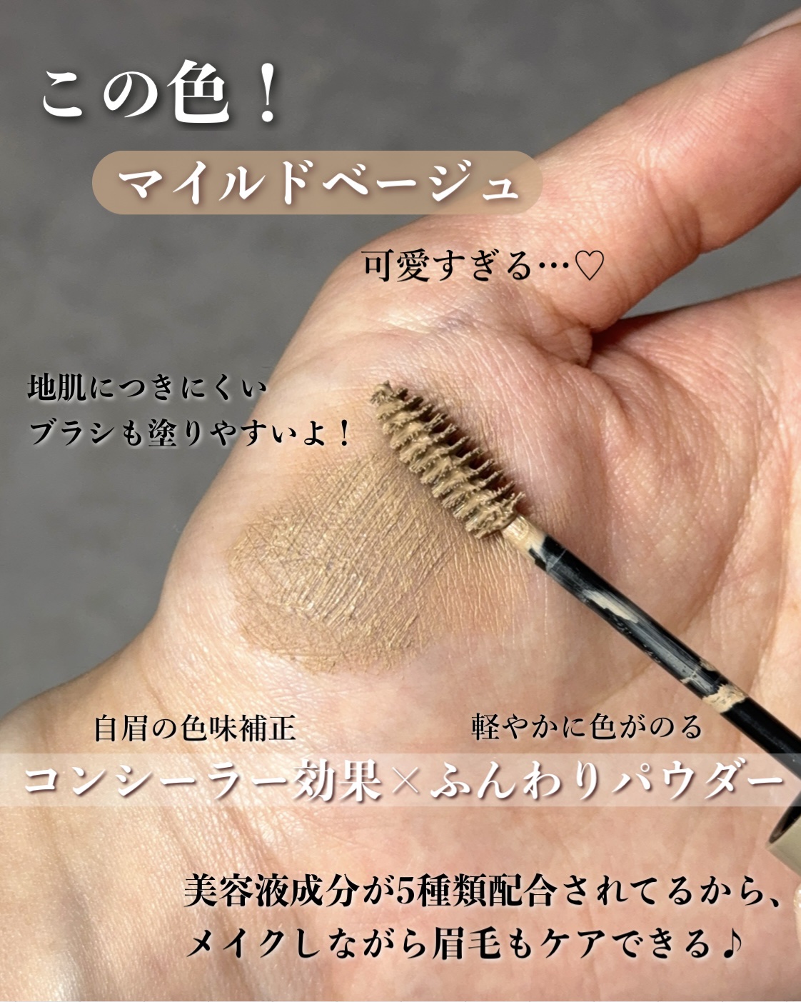 - コンシーラー効果とふんわりパウダーが、まるでまゆげ脱色したみたいな垢抜け眉を演出。 汗・水・皮脂・こすれに強く長時間つけたてのような高発色をキープ さらにパリパリ知らずなうすふわ処方でふわっと毛流れもキープします✨ コシのあるブラシで、眉毛1本1本をキャッチ!地肌に液がつきにくいのもメイク初心者さんにおすすめです。