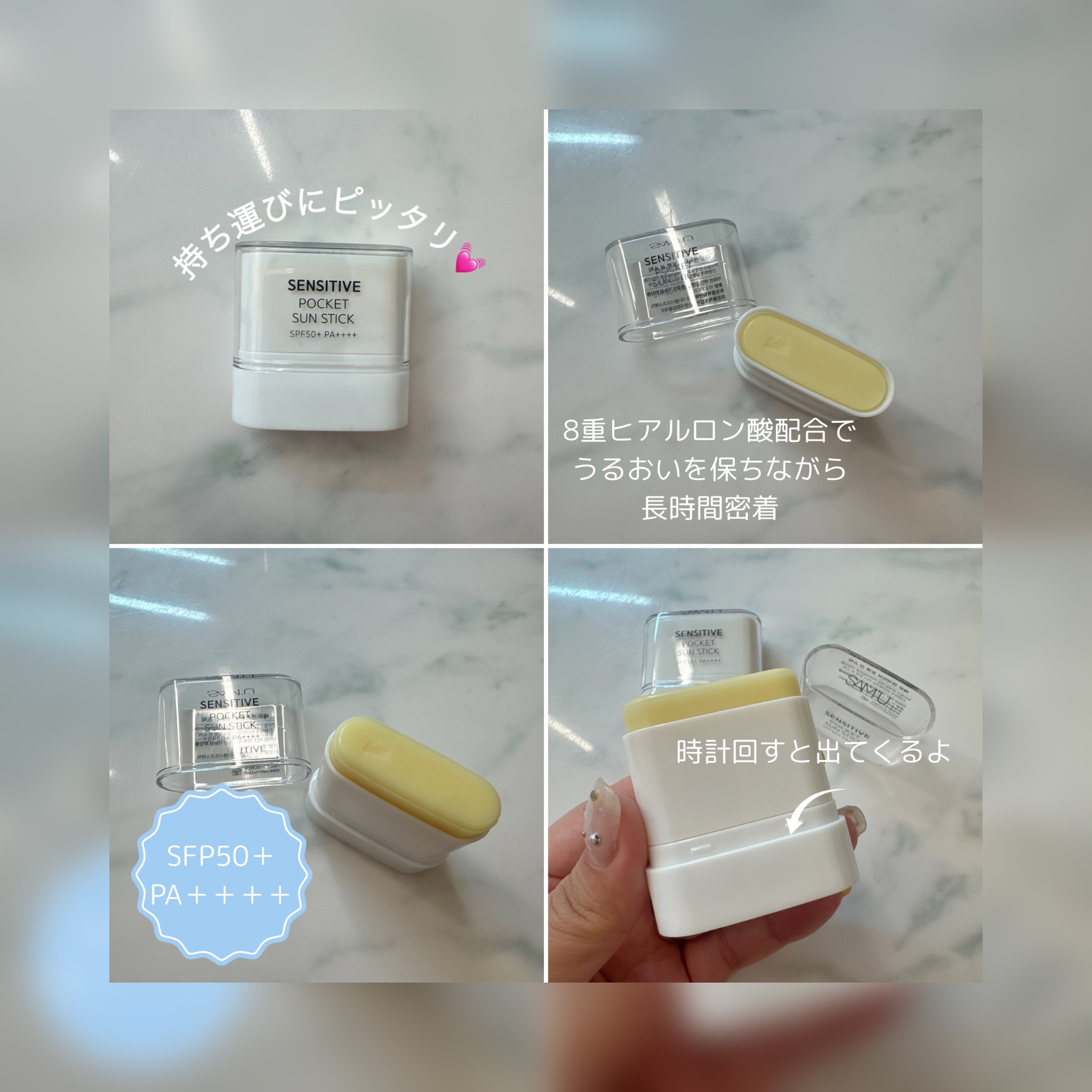 - ミニポケットサイズで、いつでもどこでも手軽に紫外線対策。 10gの小さくて軽いポケットミニサイズで、どこへでも携帯でき、ひと塗で簡単に使える手軽さをお届けします。 8種類のヒアルロン酸(保湿成分)を配合し、うるおいをプラス。 さらに多孔質パウダーを含むことで、何度塗り直してもテカらず、さらっと仕上がります。 SPF50+、PA++++の高い紫外線カット効果を持つポケットサンスティックです。