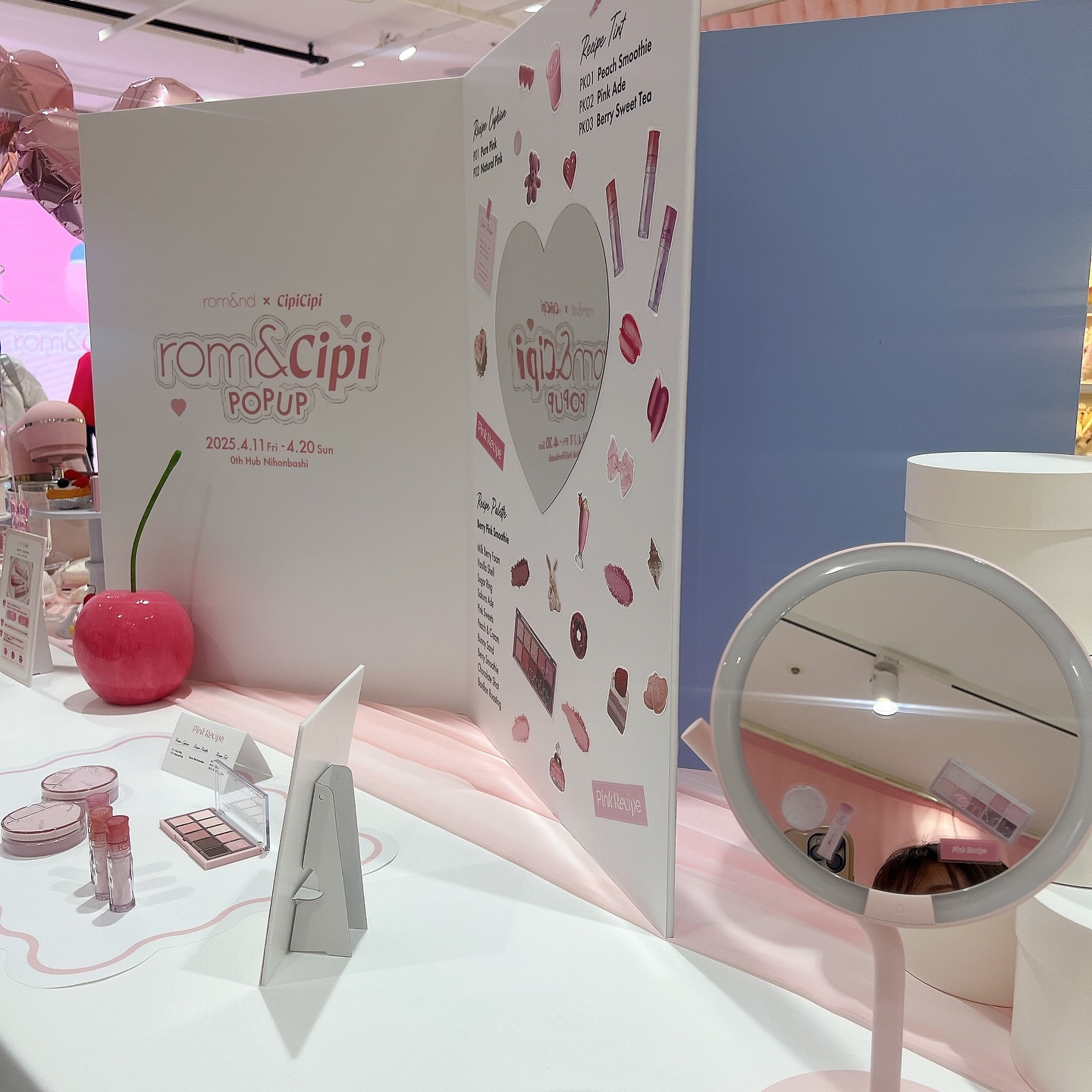 明日から始まるrom&cipiのポップアップに行ってきたよ♥今回のコラボテーマであるピンクを基調とした、ポップでキュートな店内。今回のロムシピコラボのリップやアイパレット、クッションファンデはもちろん、他のアイテムも先行で購入可能です😊💞4,...