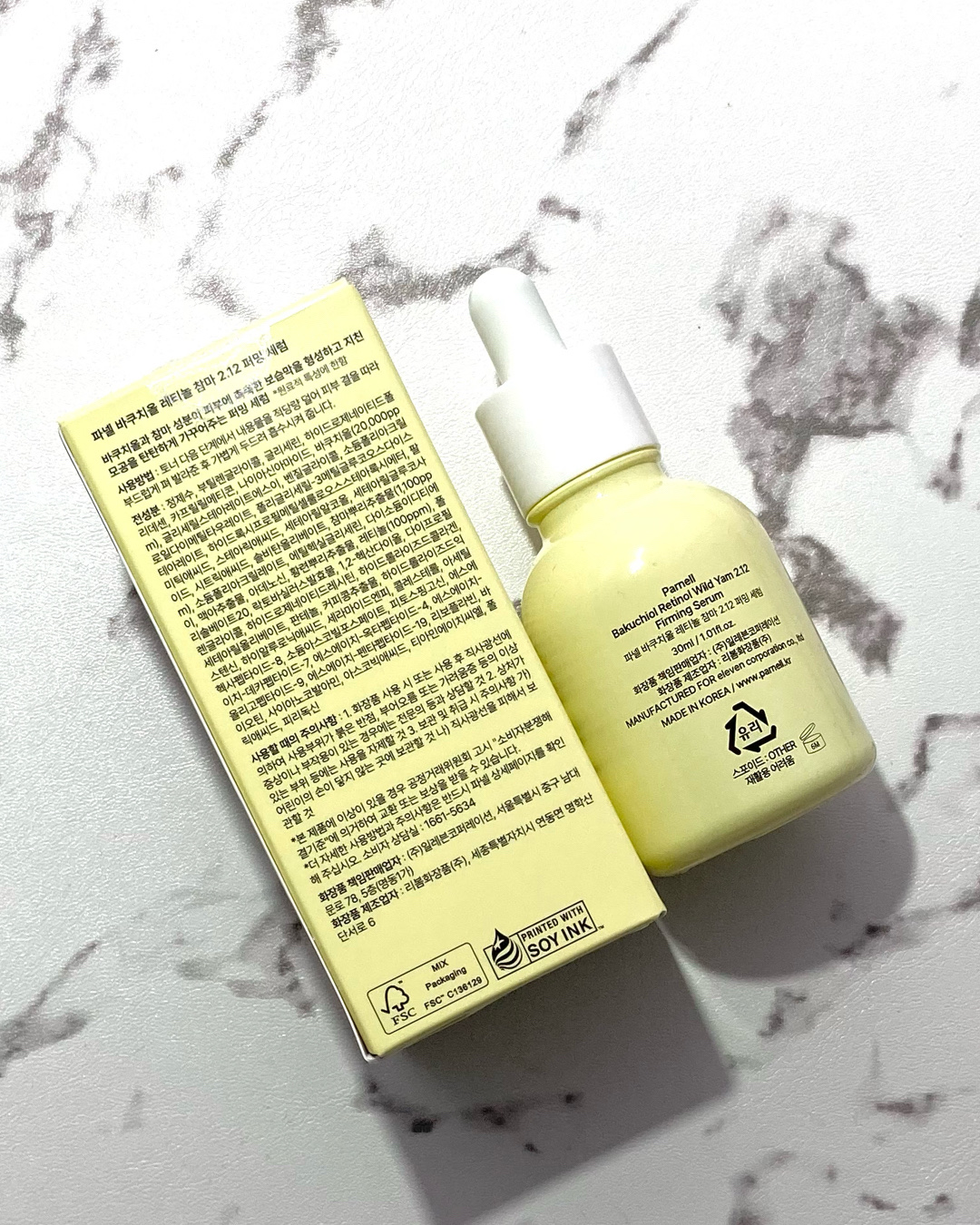 - <Bakuchiol Retinol Wild Yam 2.12 Firming Serum> 水、BG、グリセリン、ステアリン酸、ヒドロキシプロピルメチルセルロースステアロキシエーテル、エチルヘキシルグリセリン、DPG、セテアリルアルコール、ヒアルロン酸、アスコルビン酸、水添レシチン、加水分解コラーゲン、クエン酸、セラミドNP、ポリアクリル酸Na、コレステロール、フィトスフィンゴシン、セテアリルグルコシド、レチノール、オウレン根エキス、パンテノール、パルミチン酸、ポリソルベート20、アスコルビルリン酸Na、1,2-ヘキサンジオール、ステアリン酸グリセリル(SE)、シアノコバラミン、EDTA-2Na、水添ポリデセン、アセチルヘキサペプチド-8、ナイアシンアミド、リボフラビン、ビオチン、アデノシン、ピリドキシン、ジステアリン酸ポリグリセリル-3メチルグルコース、乳酸桿菌発酵液、カプリリルメチコン、オリーブ油脂肪酸セテアリル、オリーブ油脂肪酸ソルビタン、ヤマノイモ根エキス、葉酸、ポリアクリロイルジメチルタウリンNa、合成ヒト遺伝子組換オクタペプチド-4、合成ヒト遺伝子組換デカペプチド-7、合成ヒト遺伝子組換ペンタペプチド-19、チアミンHCl、コーヒー種子エキス、ベンジルグリコール、バクチオール、バクガエキス、加水分解エクステンシン、合成ヒト遺伝子組換オリゴペプチド-9