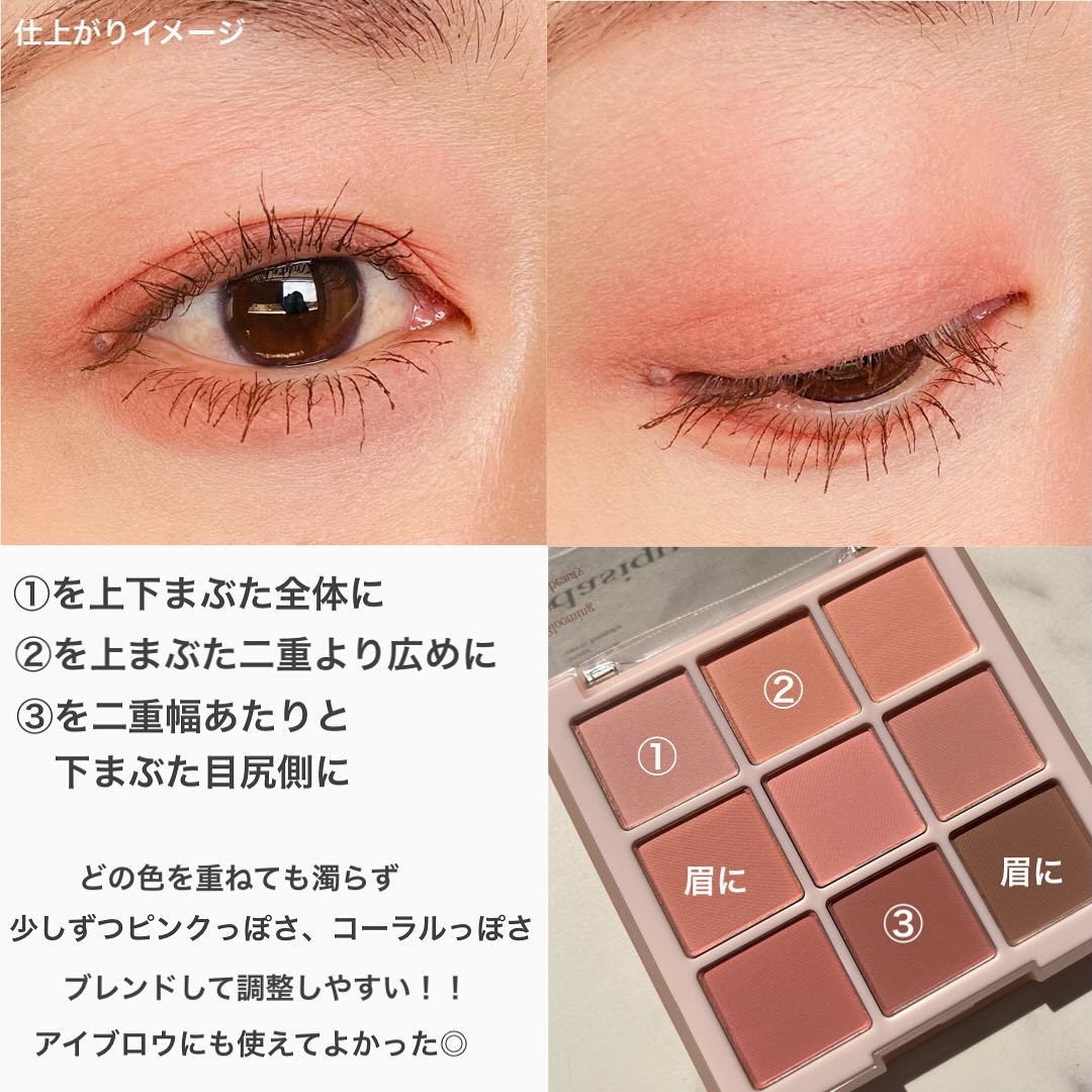 マットは肌に溶け込むような粉質でボソボソしません! シマーのしっとりした粉質も密着してくれて好き!!! 1番キラキラなのは右上のラメですね🍑💓でも粒が大きくないので、大人も使いやすいラメだと思います🥰 どの色使おうか迷うけど、どれ使っても本当可愛くて、自分が桃になったかのような🍑(笑)多幸感あふれるパレットです💘