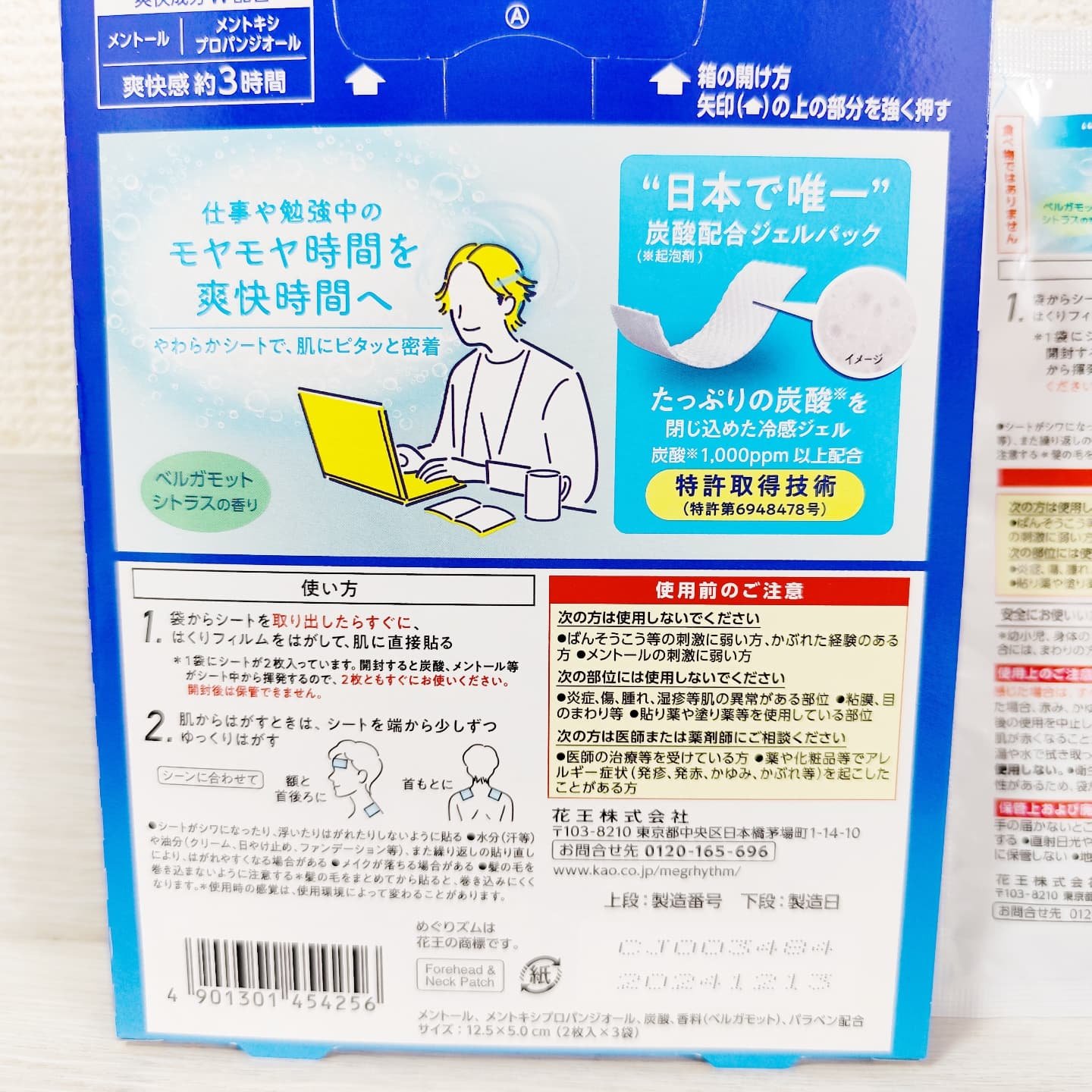 - 日本で唯一!たっぷりの炭酸(起泡剤)を閉じ込めた冷感ジェルパック。 一度貼れば、クリアな爽快感が約3時間持続。 ジュワ~ッと心地よさが広がります。 仕事や勉強中のモヤモヤ時間を爽快時間へ。 シーンに合わせて、貼り方を選べます。(額と首後ろに/首もとに) ●炭酸1,000ppm以上配合でパックやわらか ●特許取得技術(炭酸シート製造技術) ●爽快成分W配合 ●ベルガモットシトラスの香り