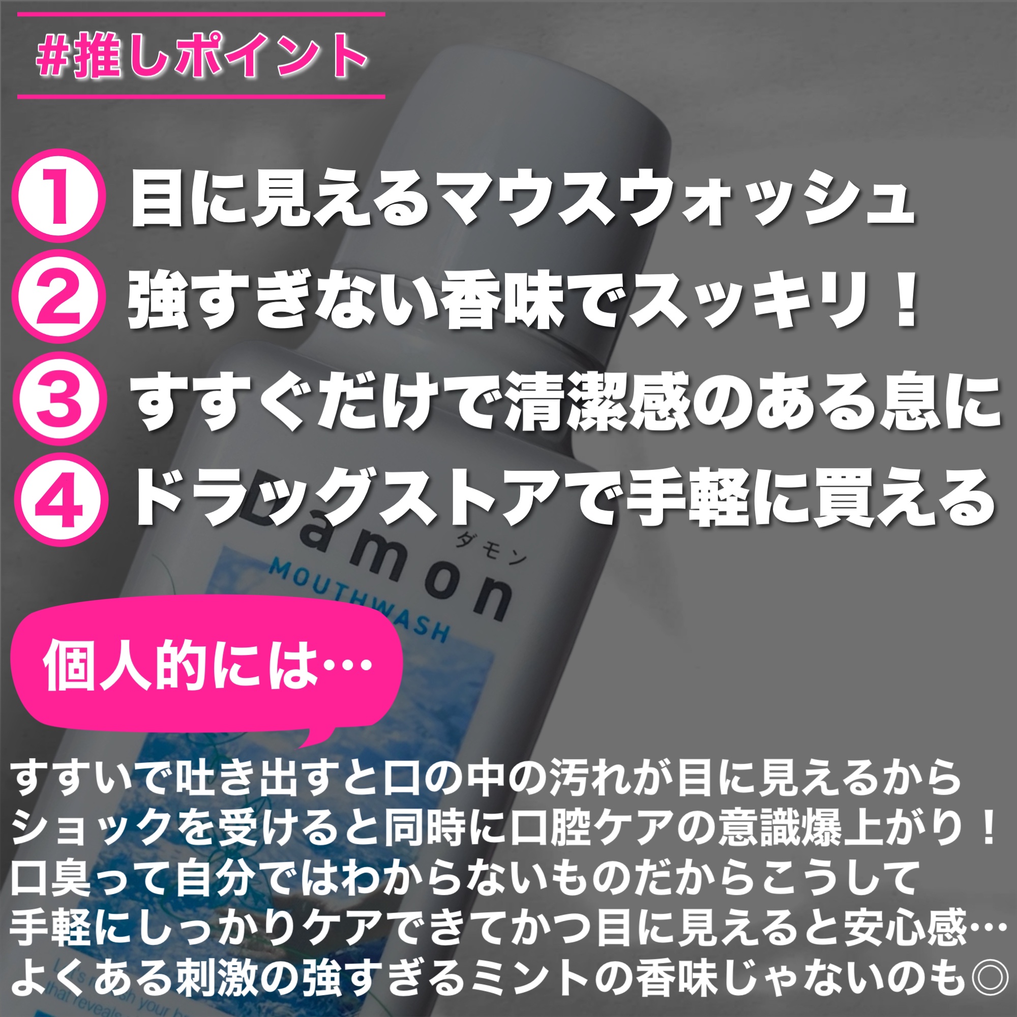 🌸汚れが見える!マウスウォッシュ🌸▷DamonリラックスミントLIPSのプレゼント企画でいただきました。口臭の原因となるタンパク質を凝集させて"よごれ"として目に見えるタイプのマウスウォッシュです。1回量は20mlで容器の蓋にメモリがついてい...
