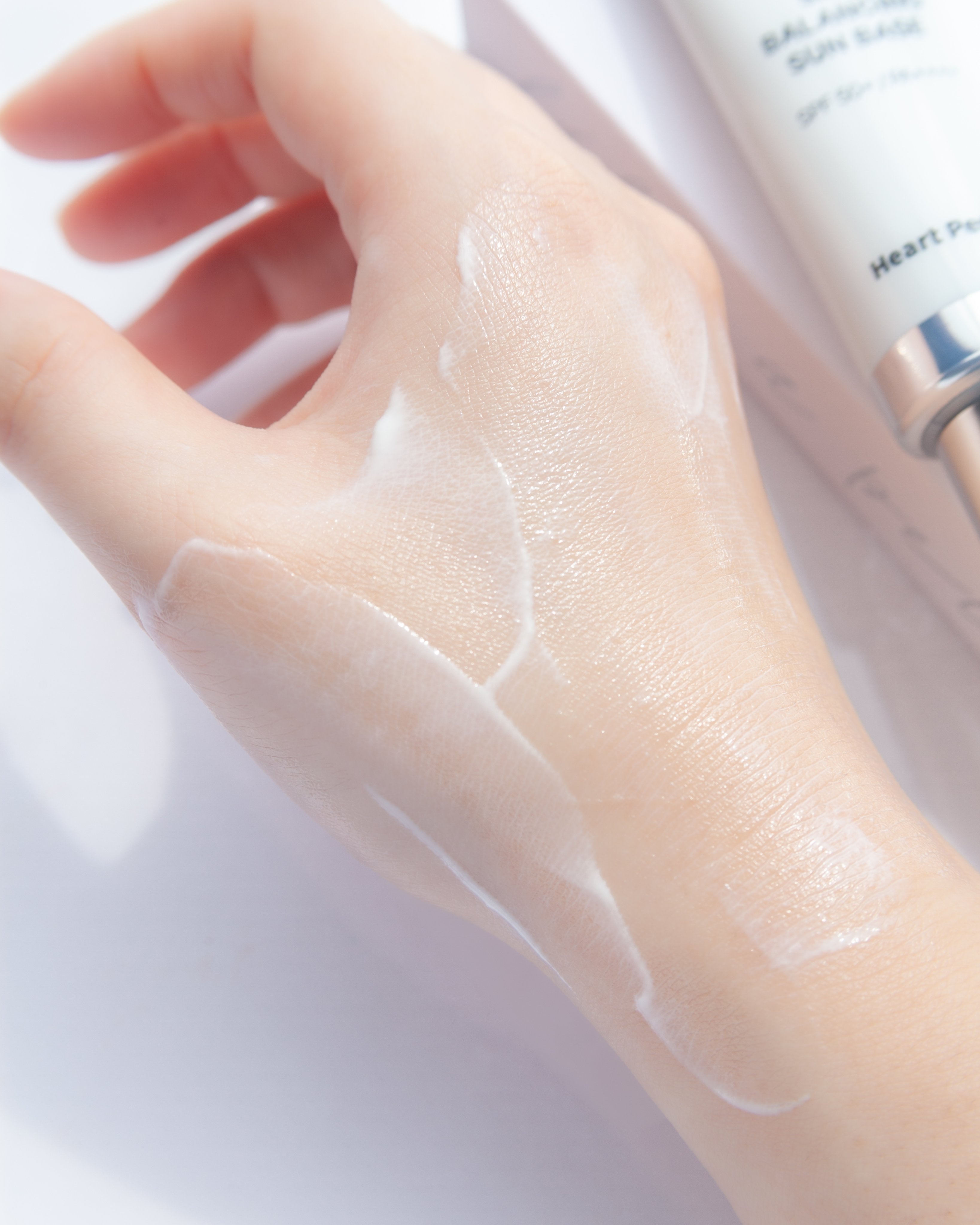 HeartPercentから多機能日焼け止め登場🧴☀️✦HeartPercentスキンバランシングサンベースSPF50+PA+++白色のクリームのようなテクスチャー。柔らかくスルッと伸びてもちっとした仕上がり。白浮きも気にならず日焼け止め特有...
