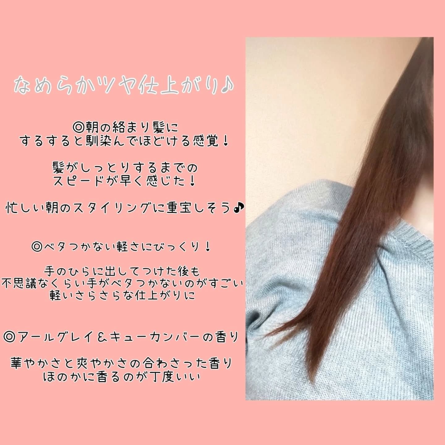 | ヘアケア・スタイリングランキング第29位 | 髪の毛がまとまりやすく、扱いやすくなった感じがして嬉しい🥰 べたつかないさらっと軽やかな使い心地で、手もべたつないから終始快適 | 詳細を見る | |