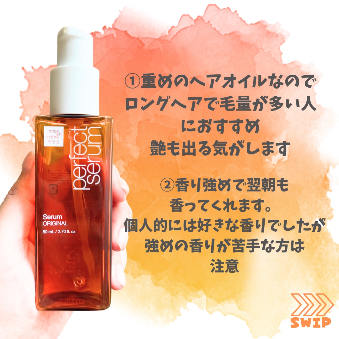 🩶miseensceneパーフェクトセラムウォータリーセラム80ml乾燥でぱさつく髪に。水分補修だから軽めのヘアオイルです。フレッシュシトラスの香り💕オイルの重たさが苦手な方でも使えそう😊♥️miseensceneパーフェクトセラムリッチセラ...