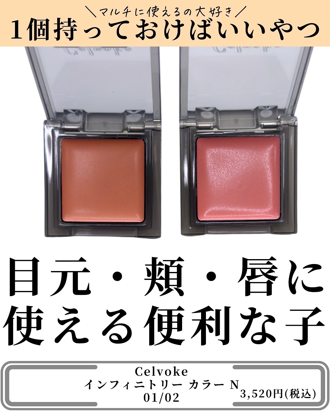 CelvokeSummerMakeupCollection4/11発売の第1弾✨◾︎インフィニトリーカラーNアイ•チーク•リップに使えるフェイスカラー。しっとり&じゅわっと血色感を出せる柔らか発色。01SeekingSteady洗練されたヘル...