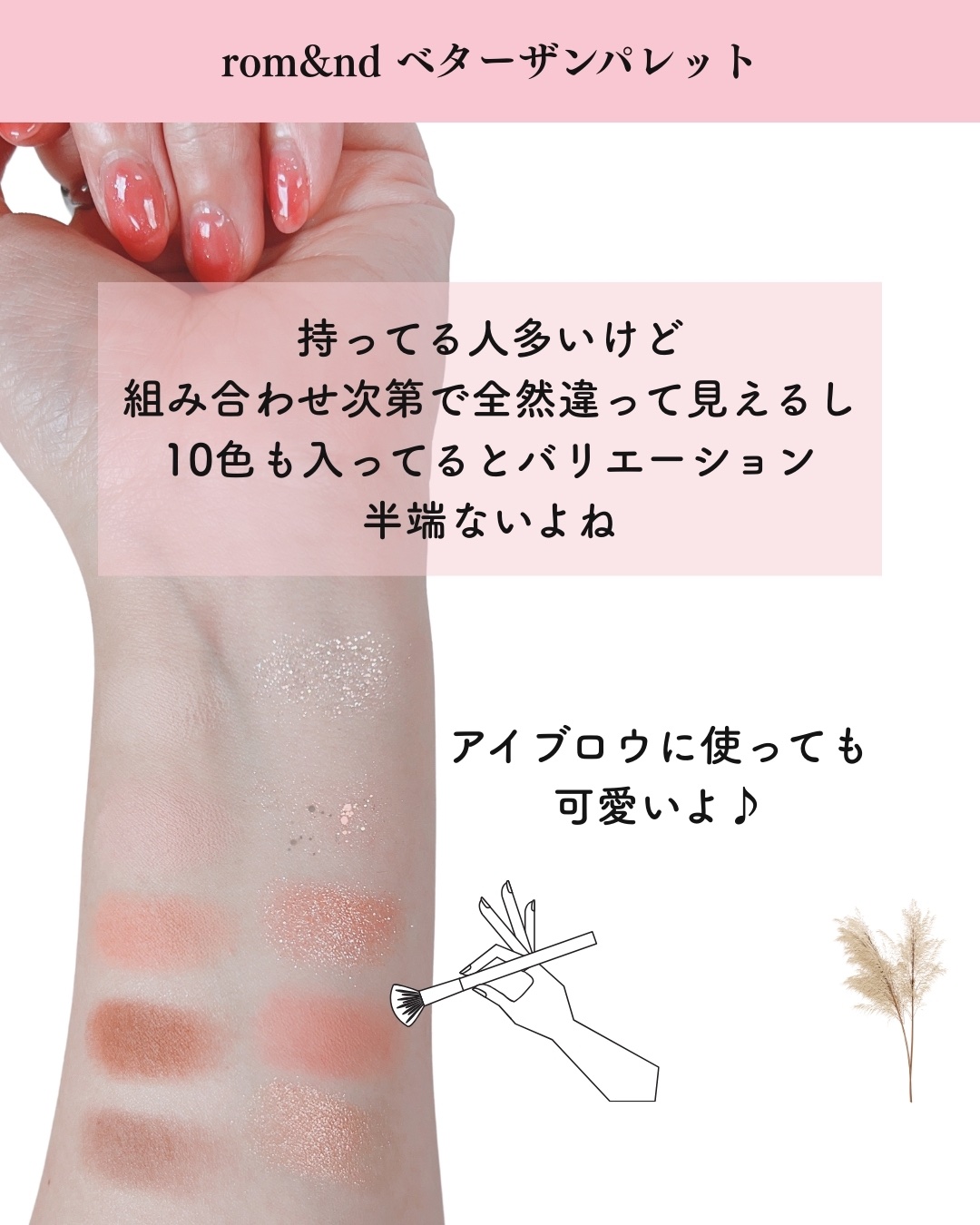 今っぽさ狙うならこれかも!?ふわっと血色感のある目元へ💕🛍️rom&nd(ロムアンド)ベターザンパレット05シェイド&シャドウガーデン10色入りの全色マットなパレット!いろんな組み合わせができるから甘めにもオフィス系にもいける✌🏻さらっとした...