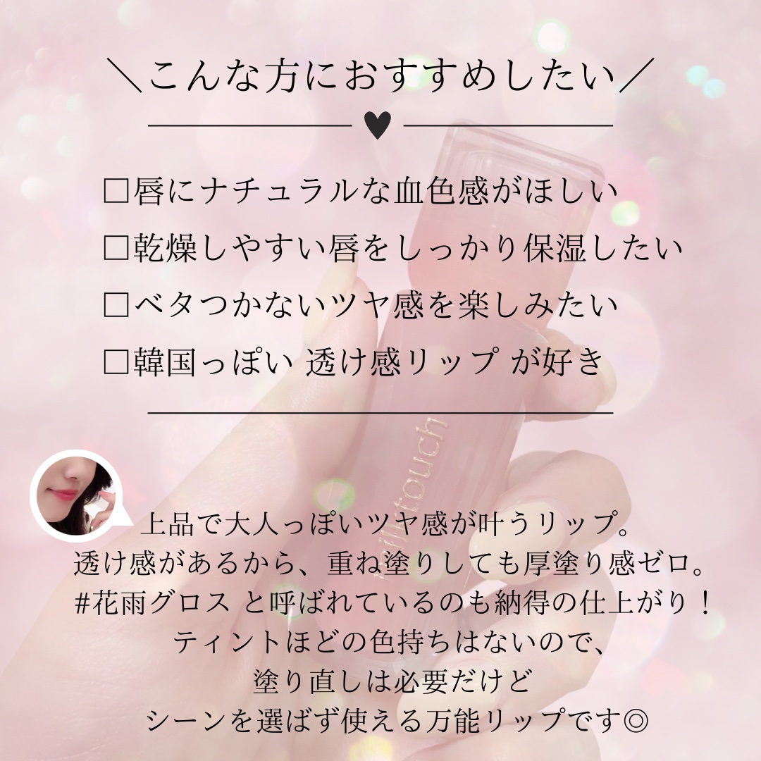 | リップグロスランキング第31位 | パールがキラッキラに煌めいて大変華やかな仕上がり かなりサラサラなテクスチャーで 手持ちのリップに重ね付けしてももったりしにくいのがいい ちゅるちゅるな潤い水膜感でぷっくらリップに💋 | 詳細を見る | |