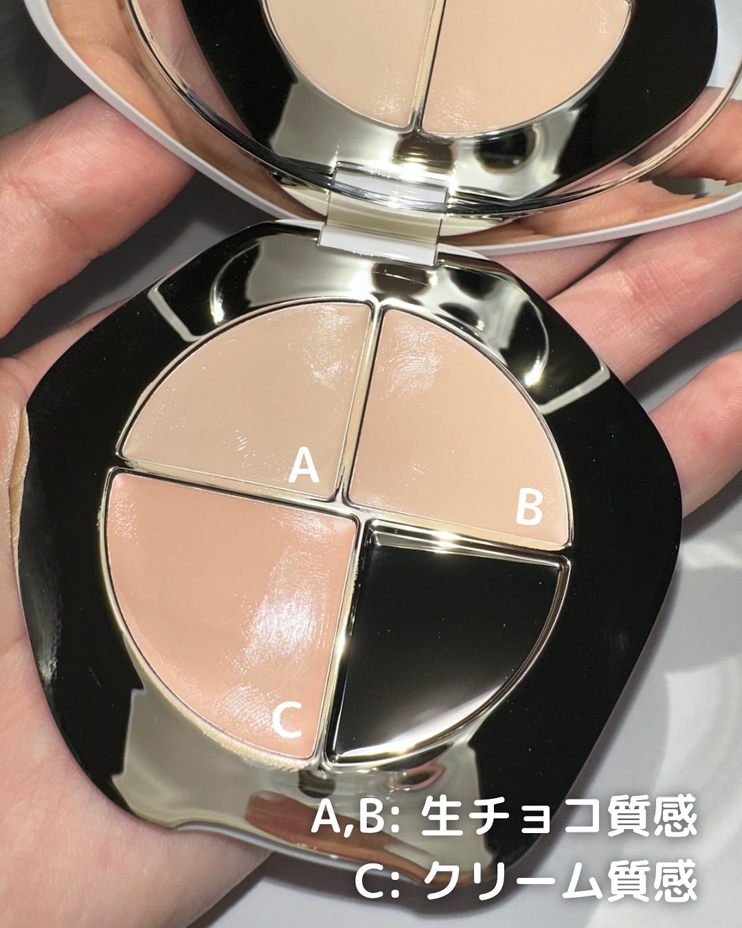 生チョコのような質感、みずみずしく肌に密着◡̈ もちもちとした生チョコのような質感で、肌との密着性に優れ、肌に自然になじむコンシーラーです♡ 色ムラやニキビ跡、シミ、ほくろなどの肌悩みを一つのパレットでカバーできます。
