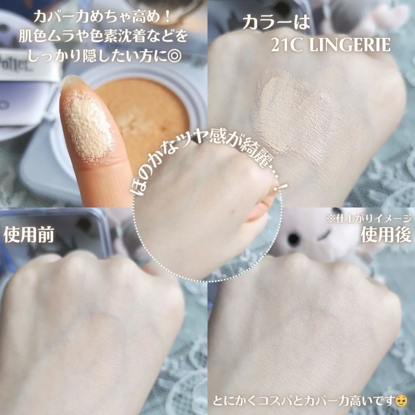 - SPF 50+, PA+++ いつでも簡単に綺麗なお肌を演出 デイリーキルカバークッション 1回の使用でシミ、くすみカバー及び長時間カバー持続* 長時間メイクアップフィックス(メイク浮き防止)* マスク色移り防止人体適用試験済み* *当社調べ、個人差があります。(21Nリネンに実施した試験) ・バランスのとれたクッション どんな肌質でも使いやすい!様々な肌質のニーズに応えるクッション ・メイクオフする直前まで綺麗なきめ細かい「エアリーサテン肌」 キルカバーのカバー力と持続力はそのまま。さらに崩れ·ヨレ·浮きがおこっても崩れる時もきれいなクッション ・顧客のリアルボイスを詰め込んだクッション コスメを使う様々な顧客の意見を反映して作られた愛されクッション *上記は当社調べ、個人差があります。 <21C ランジェリー(LINGERIE)> 21号向け 自然で華やかなトーンのお肌の方におすすめ <21N リネン(LINEN)> 21号向け 自然なニュートラルトーンのお肌の方ににおすすめ <23N ジンジャー(GINGER)> 23~24号向け 健康的で自然なニュートラルトーンのお肌の方ににおすすめ <2024年8月21日10時よりQoo10にて先行販売>