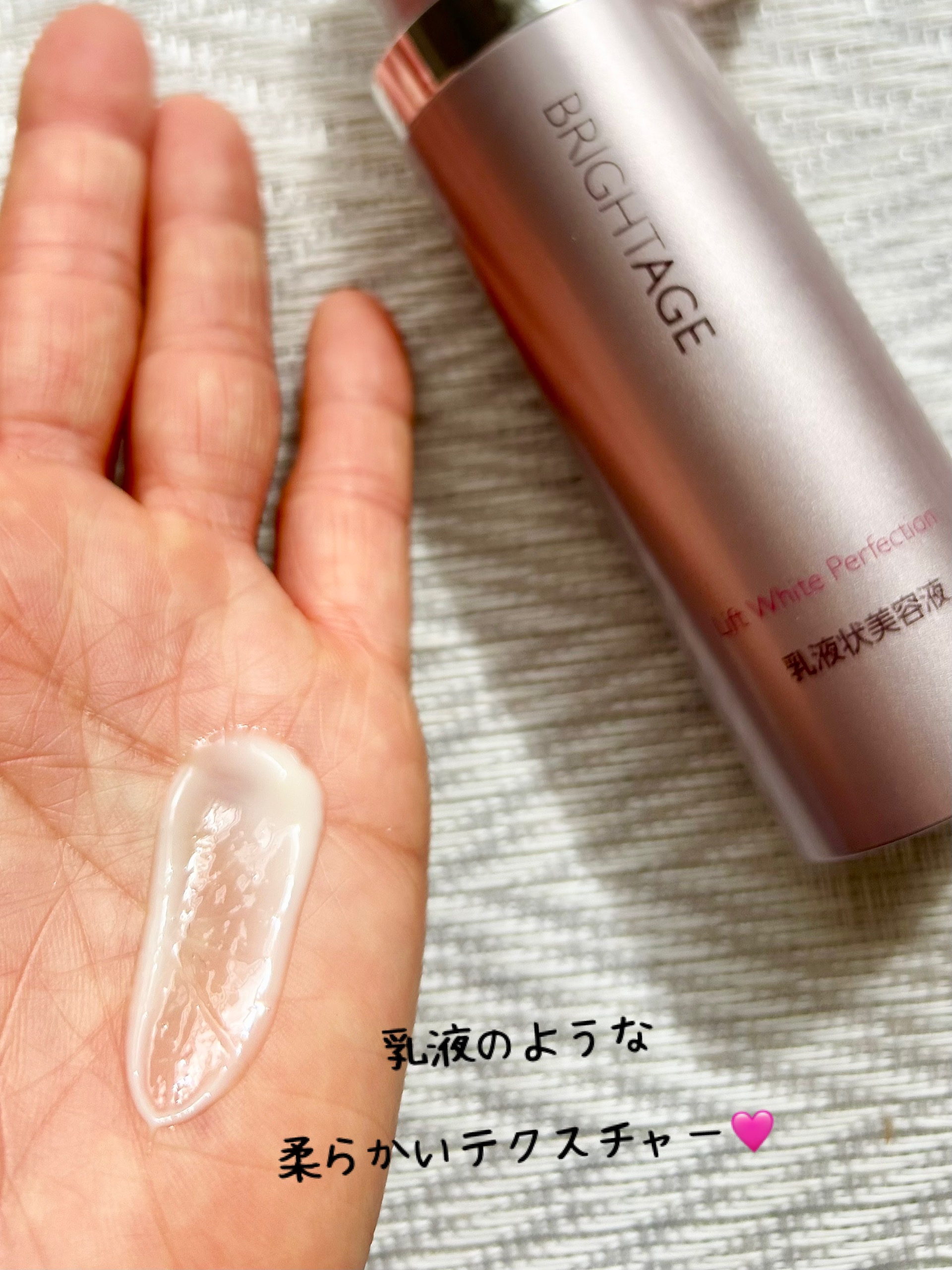 BRIGHTAGEリフトホワイトローションモイスト&リフトホワイトパーフェクション化粧水と乳液状美容液を使用しました2品でスキンケアが完結する手軽さが◎朝、保育園に送る前はバタバタしがちなので時短になりとても助かっています!化粧水はとろっとし...