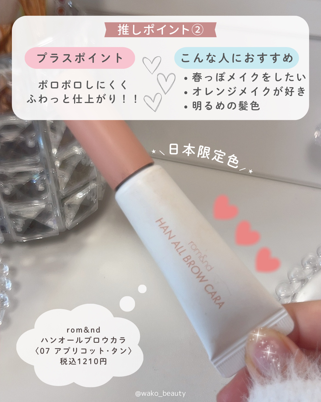 手持ちの物と色比べ✨抜群の発色と塗りやすさと色持ちの良さ🩷✼••┈┈••✼••┈┈••✼••┈┈••✼••┈┈••✼rom&nd ハンオールブロウカラ ¥1,210 07 アプリコットタンAPRICOTTAN✼••┈┈••✼••┈┈••...